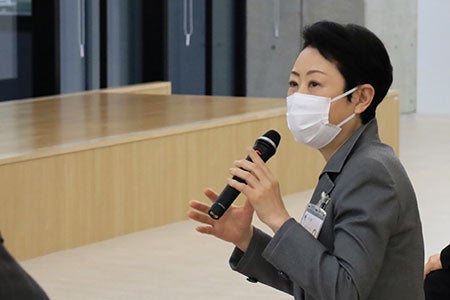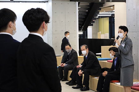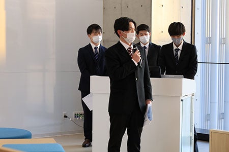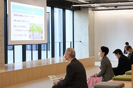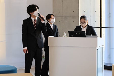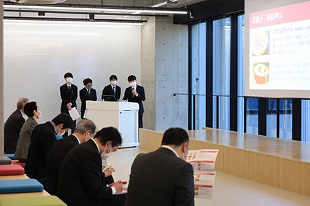 2021年4月開設の東京あだちキャンパスのある足立区では今回が初めての発表会の実施となり、当日は近藤区長と関係者の方々、本学から中島学長、石塚経営学部長も出席しました。
