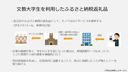 | 【本件のポイント】 ・文教大学の学生が、東京あだちキャンパスの地元である足立区の協力のもと、一年を通して行政の政策事例や抱える課題を学習 ・グループごとに課題解決のための政策を立案し、足立区長へ提言を実施 |