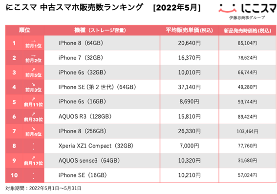 - にこスマ 中古スマホ販売数ランキング [2022年5月]