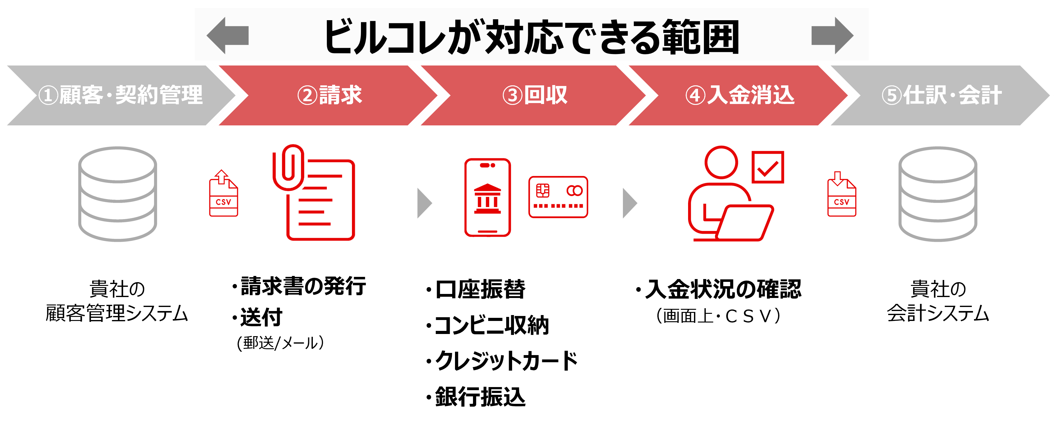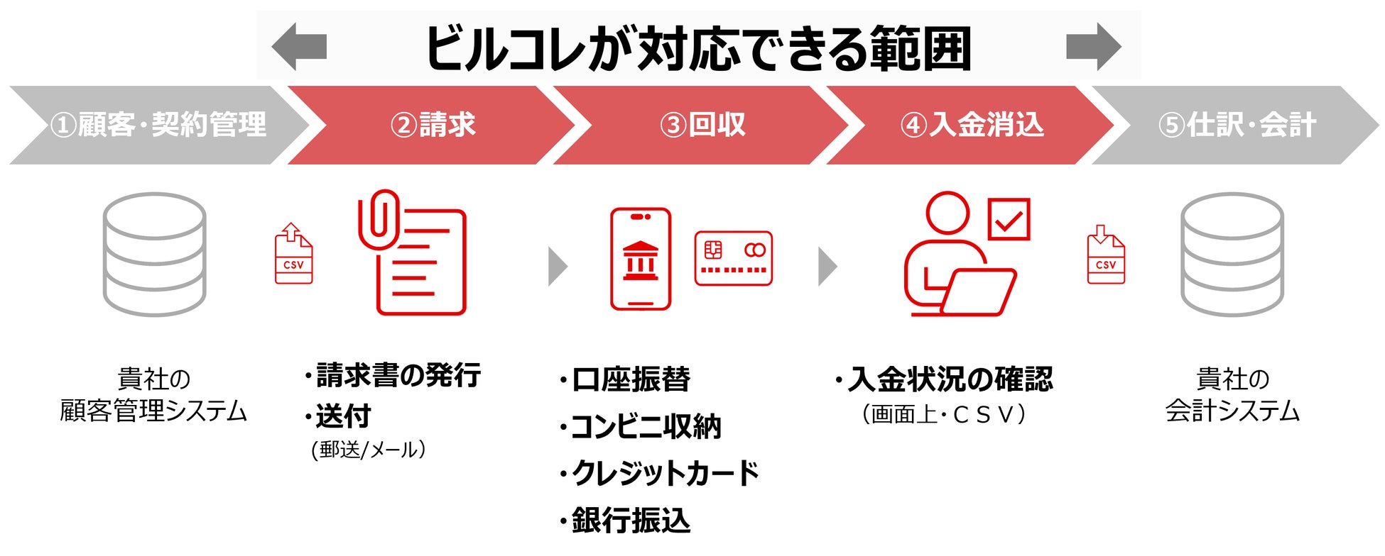 請求書の発行~送付、および複数回収手段の一元管理ができるプラットフォームです。請求プロセス(請求・回収・入金消込)に必要な機能を搭載し、請求業務の効率化を強力にサポートします。