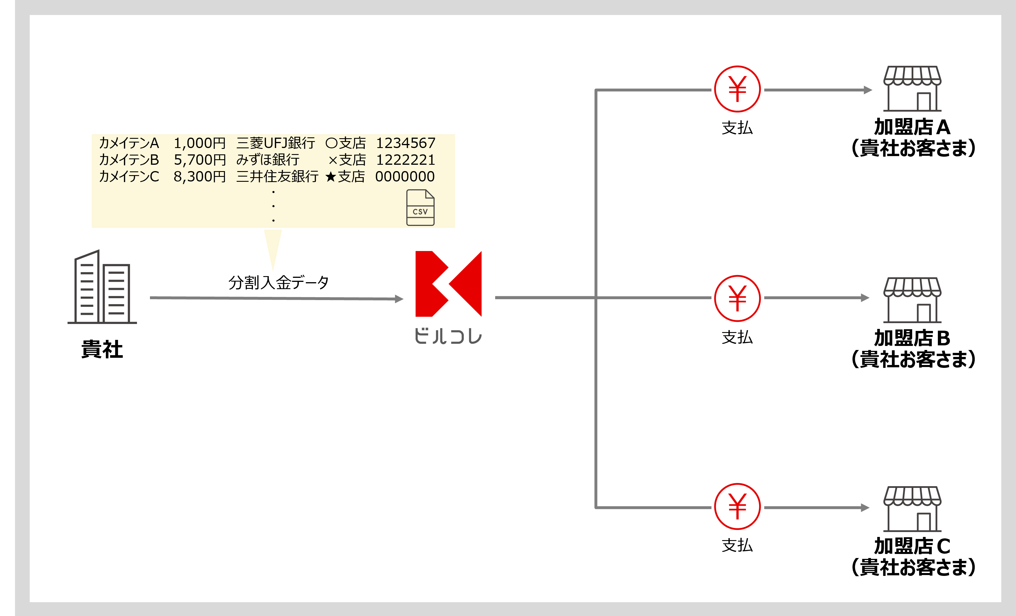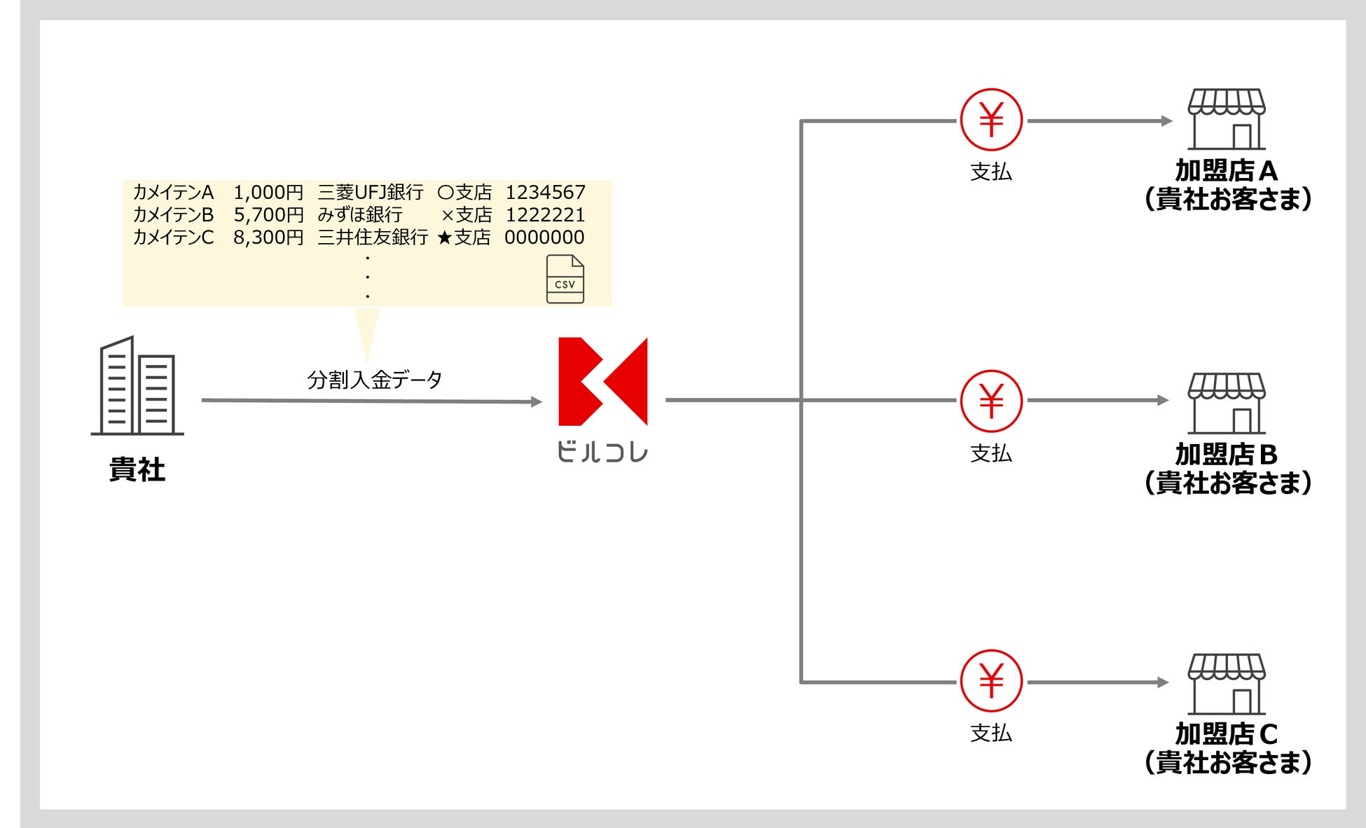 貴社の指示に基づき、回収代金(※)を加盟店さま(貴社お客さま)へ直接ご入金します。多数の加盟店さまを持つプラットフォーム・SaaS企業等において、振込業務の工数削減と信用補完に貢献します。