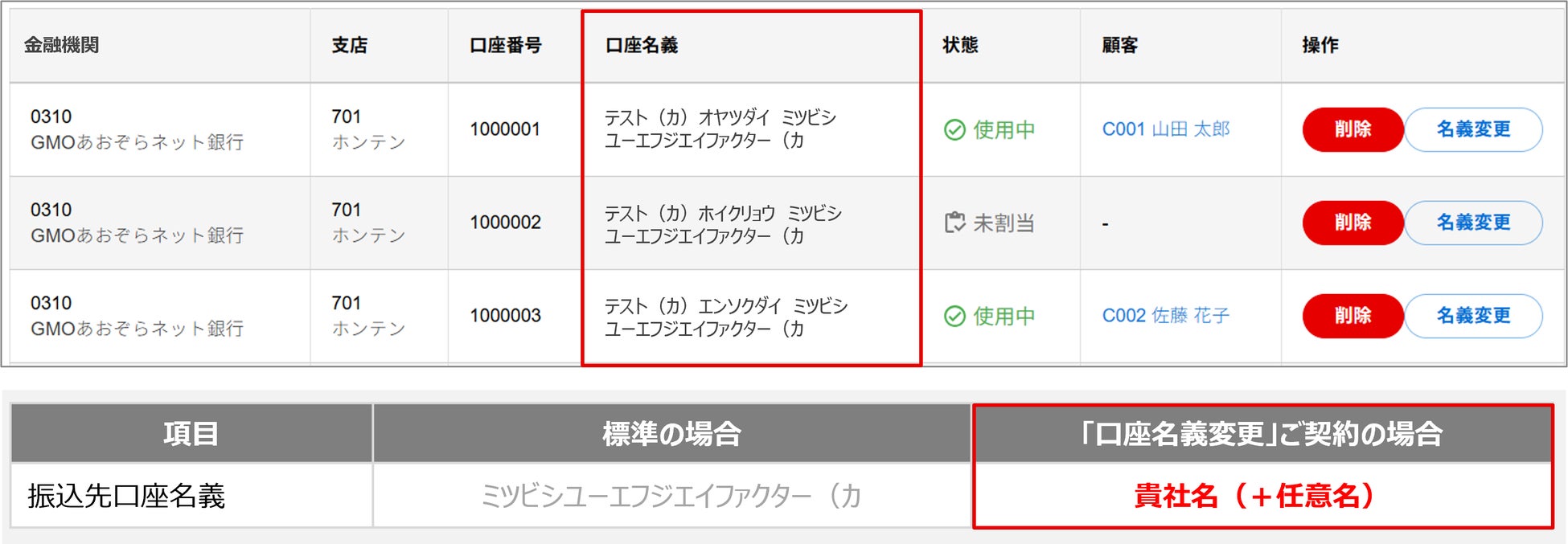 付随オプションとして、振込先の口座名義を変更できる「口座名義変更」もご用意しております。