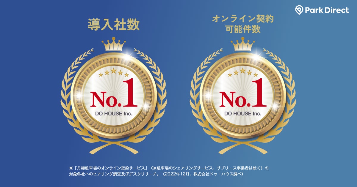 モビリティSaaSのリーディングカンパニーである株式会社ニーリー(本社:東京都中央区、代表取締役:佐藤 養太)が運営する「Park Direct(パークダイレクト)」は、株式会社ドゥ・ハウス(本社:東京都千代⽥区、代表取締役 会長:高栖 祐介、以下「ドゥ・ハウス」)が2022年12月に実施した月極駐車場オンライン契約サービスの「導入社数」「オンライン契約可能件数」の調査においてNo.1(※1)を獲得したことをお知らせいたします。