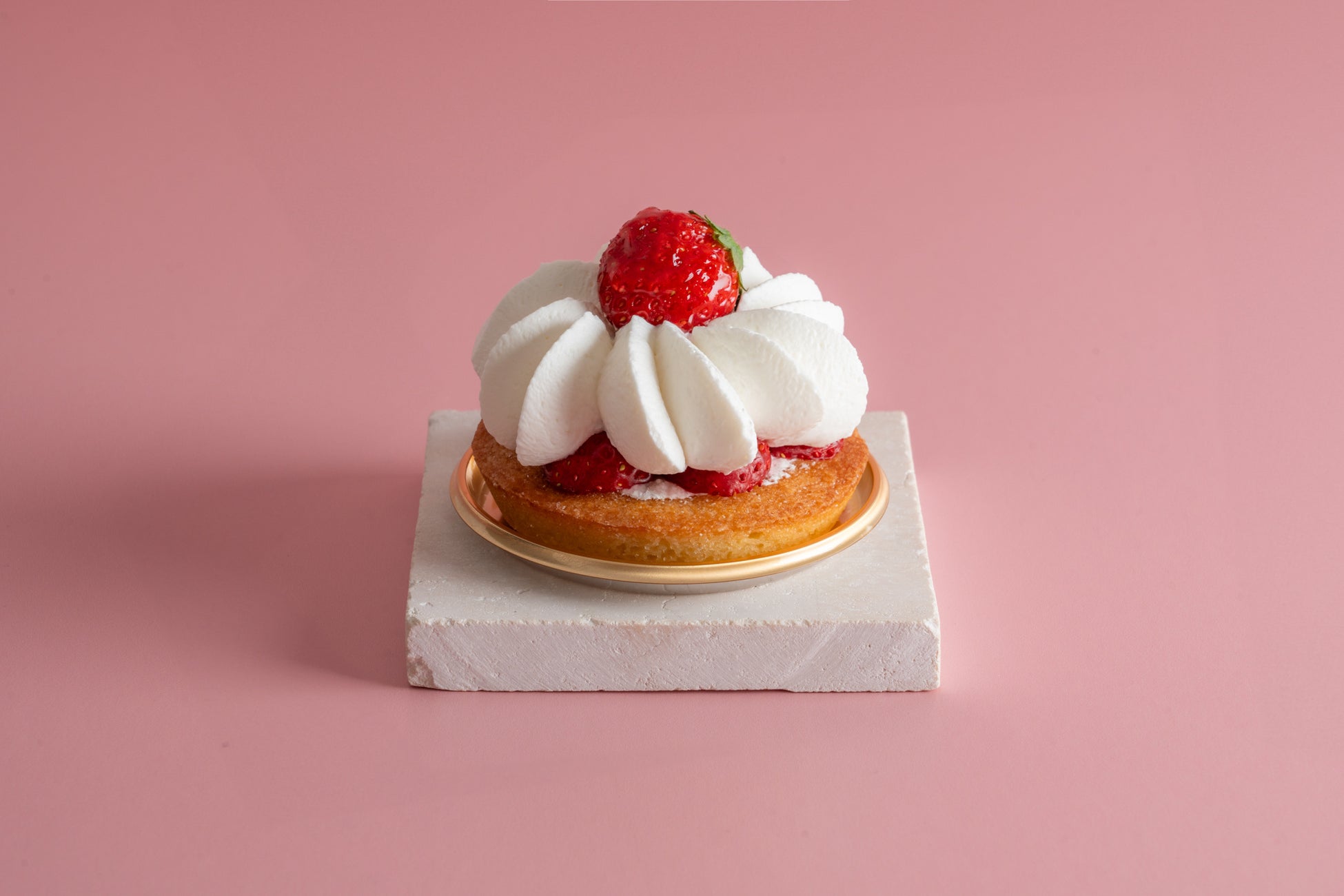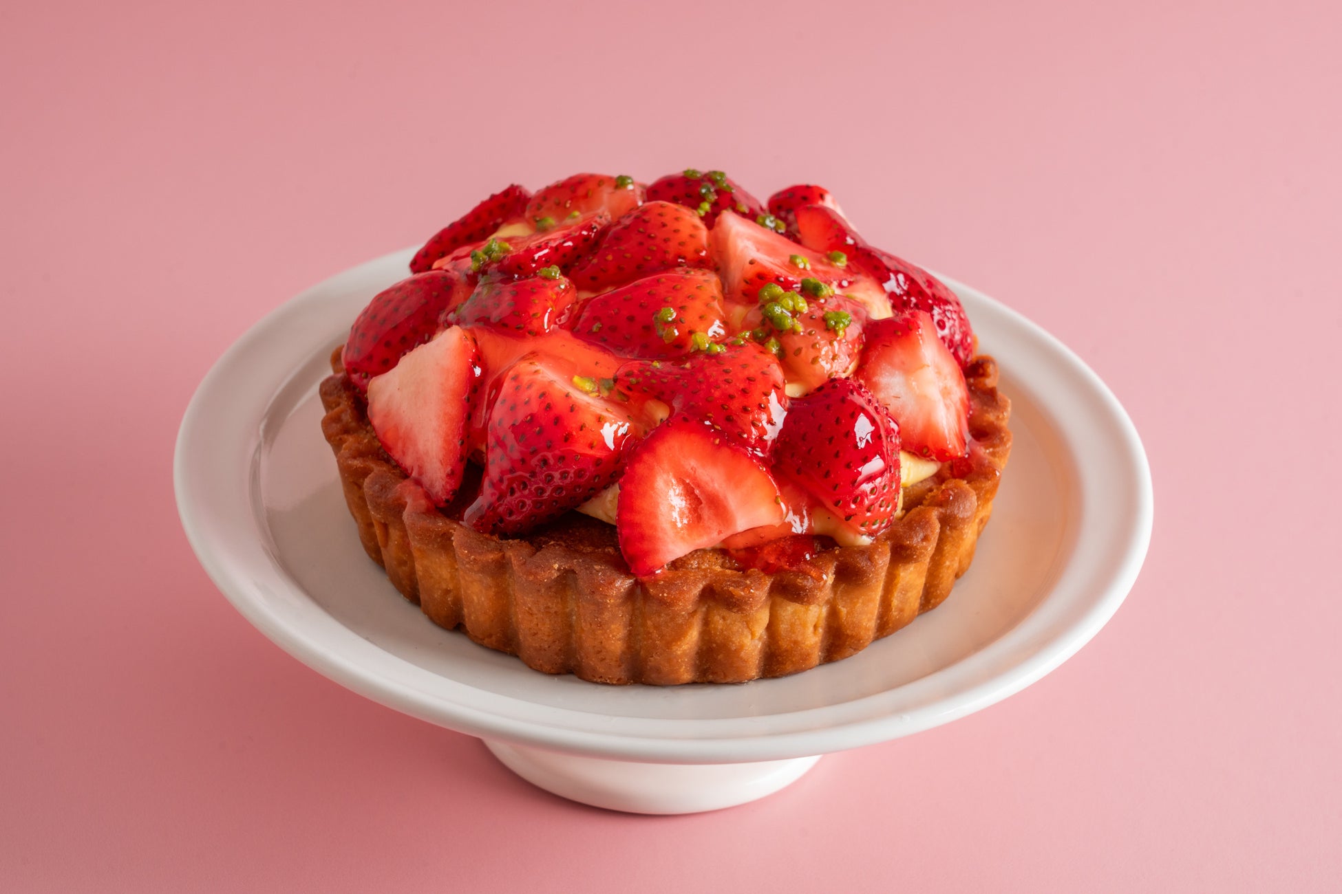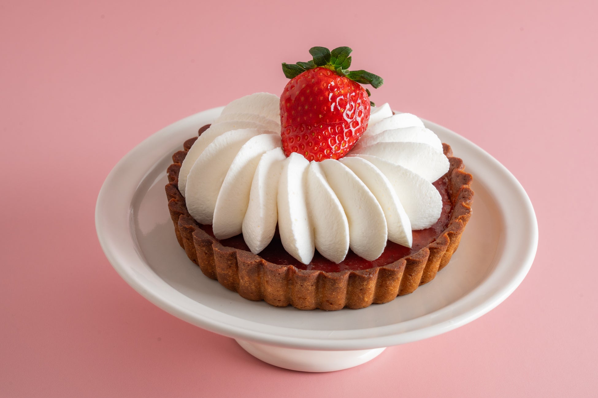 アーモンドの風味豊かな手作りタルト生地に自家製いちごジャム、フレッシュな完熟いちごを乗せて、花びらに見立てた生クリームで包み込みました。