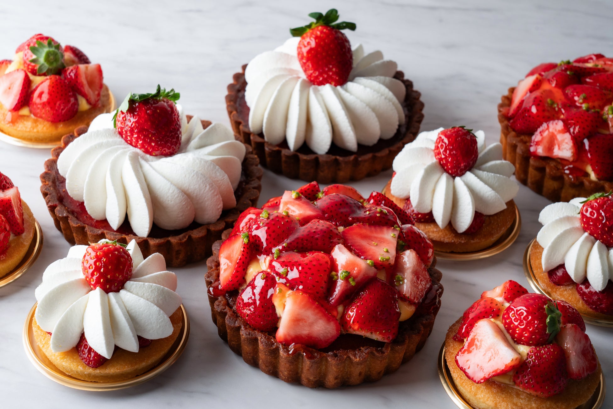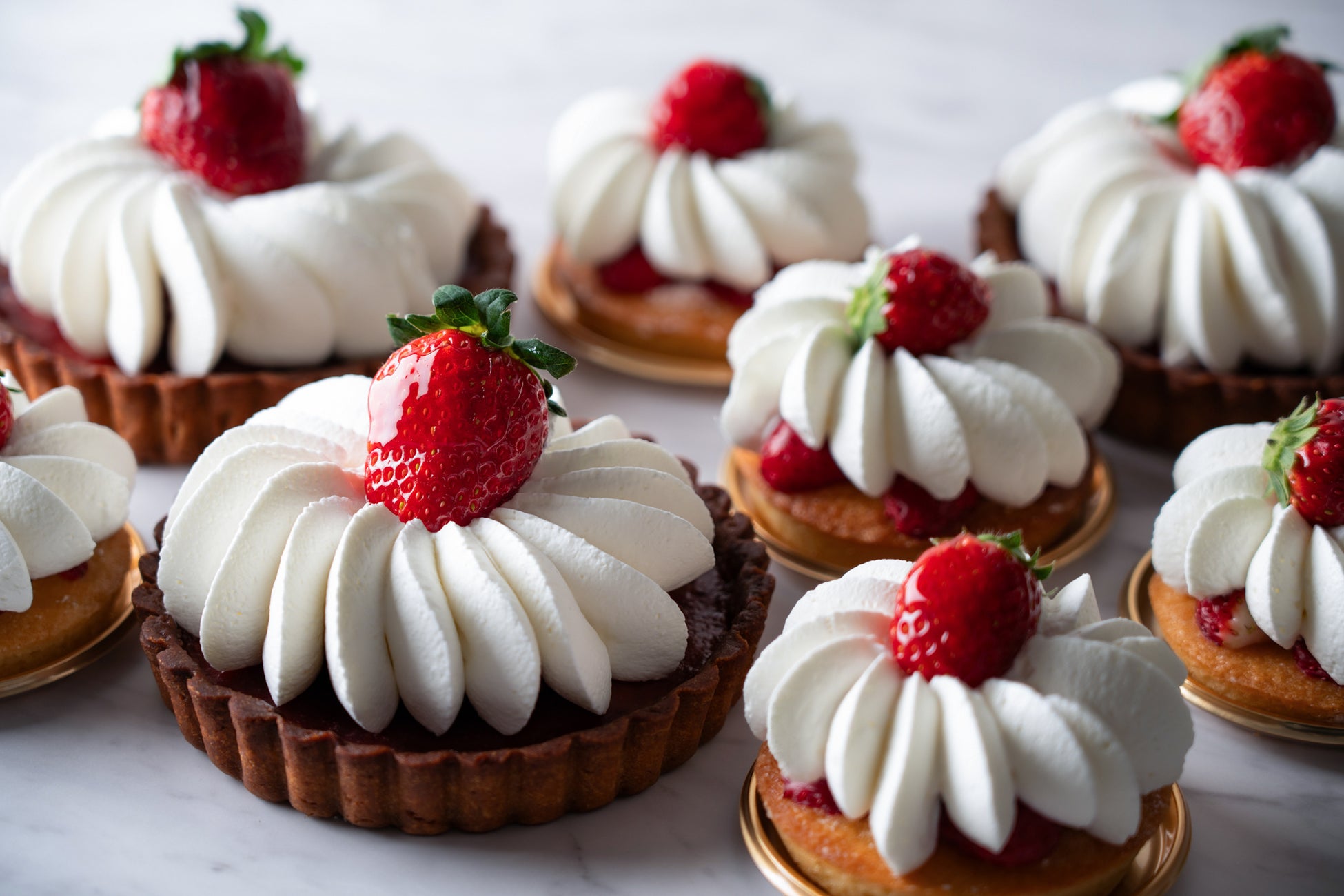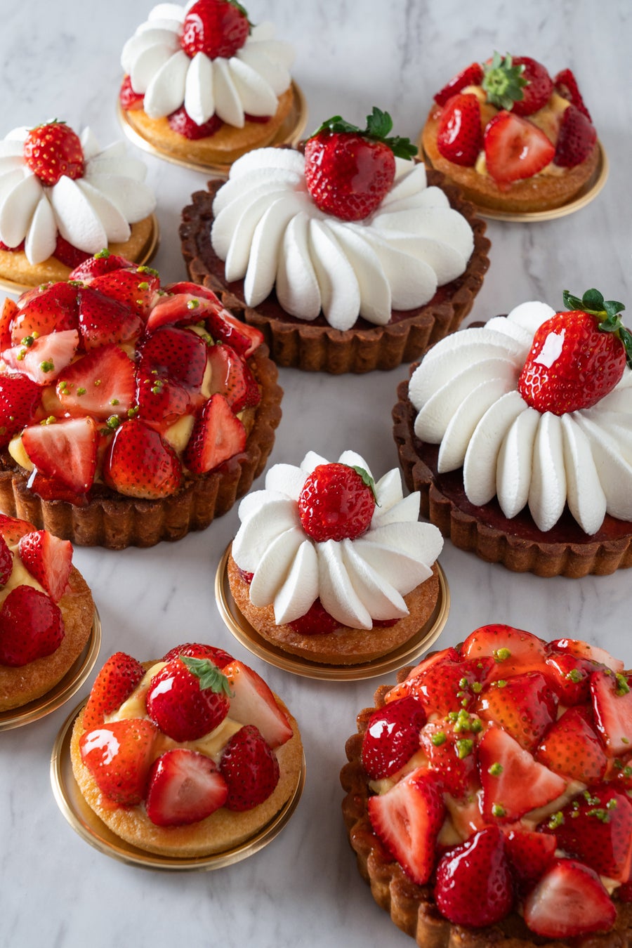アーモンドの風味豊かな手作りタルト生地に自家製いちごジャム、フレッシュな完熟いちごを乗せて、花びらに見立てた生クリームで包み込みました。