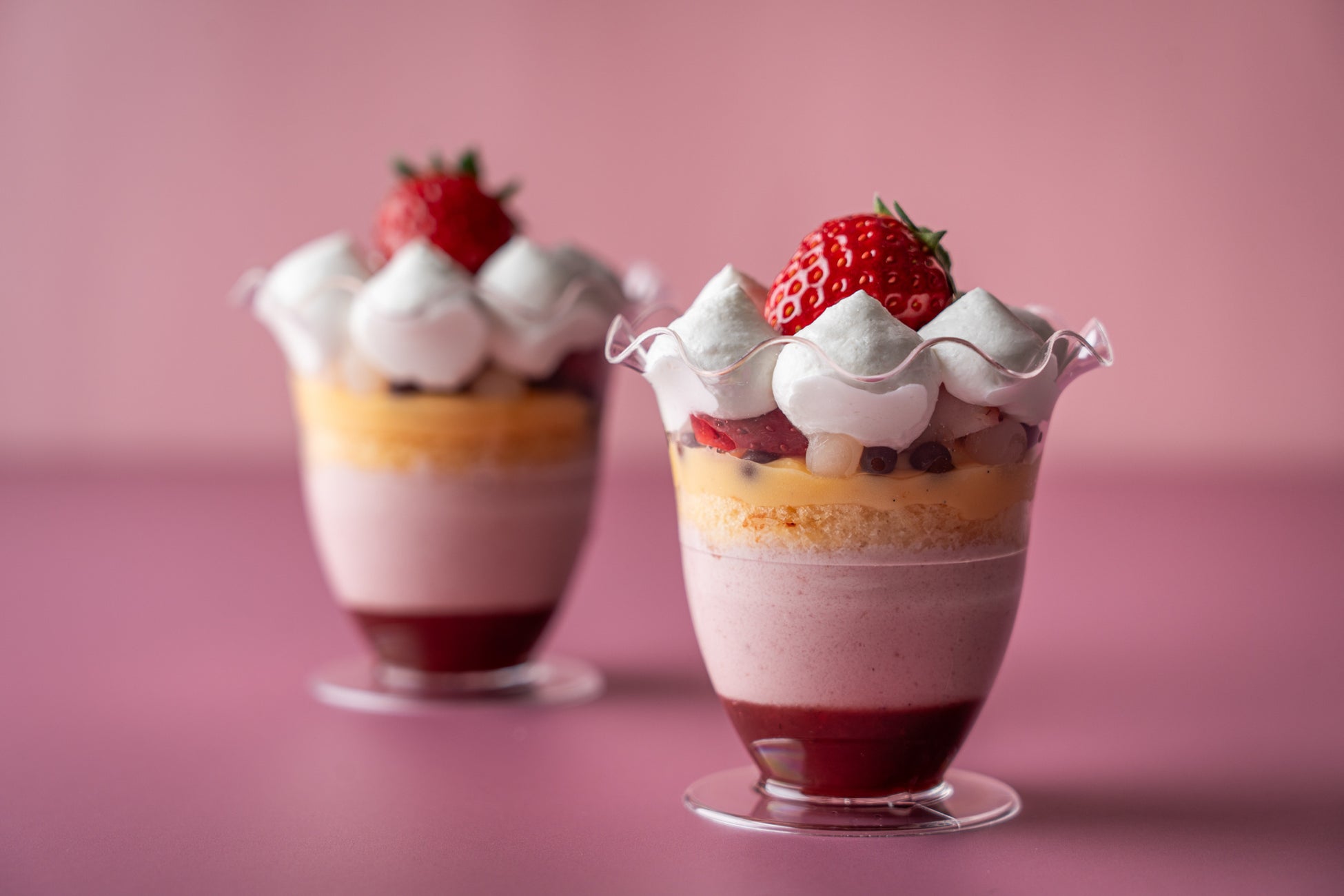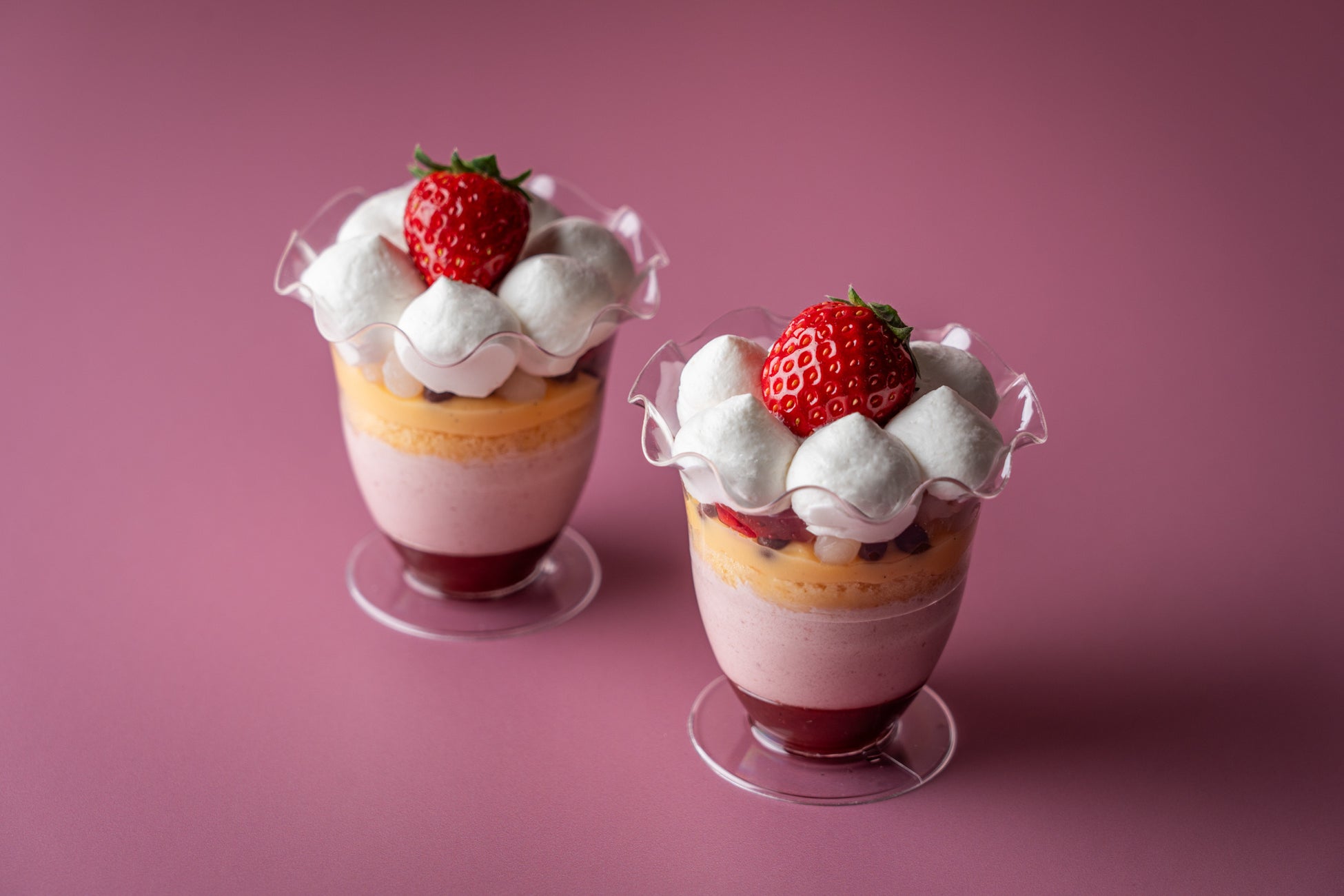 自家製いちごジャム、いちごムース、スポンジ生地、カスタードを重ねて生クリームをいちごの花びらのように絞って仕上げました。チョコクランチやおもちも入っていてサクサクもちもち、色々な食感も楽しいいちごのパフェです。