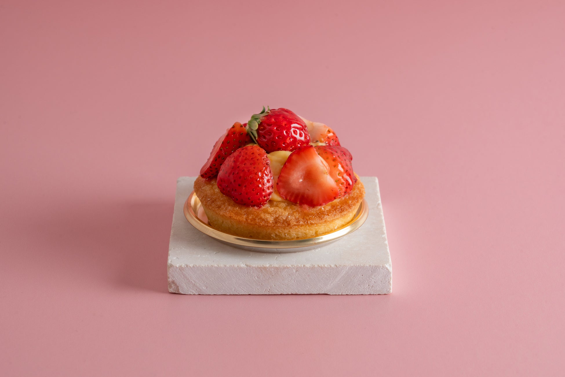 アーモンドの風味豊かな手作りタルト生地にカスタードをラウンド型に乗せてフレッシュな完熟いちごを敷きつめました。