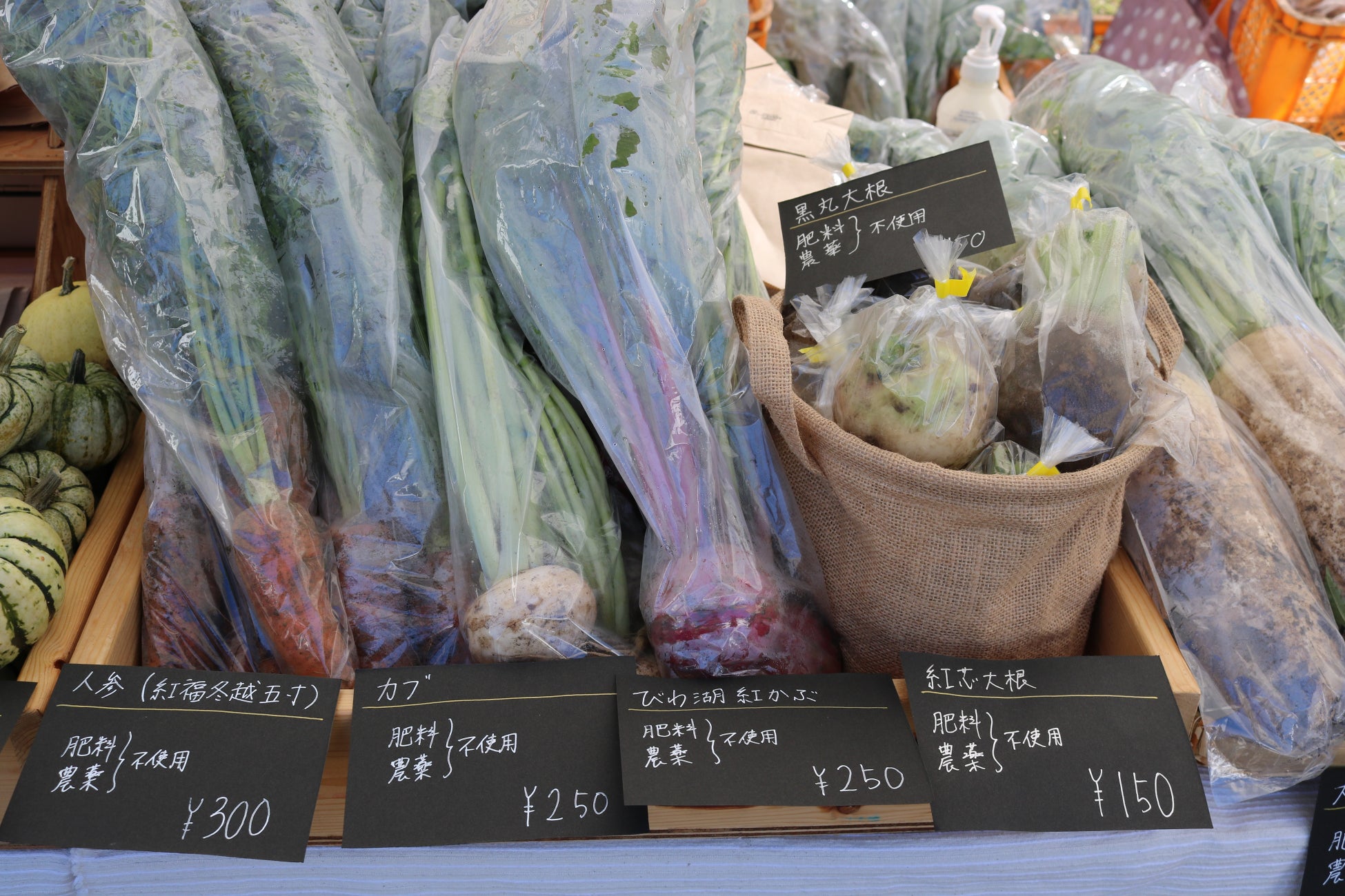 季節の有機、無農薬野菜を中心とした出店者が集まります。新鮮な旬のお野菜が並びます。