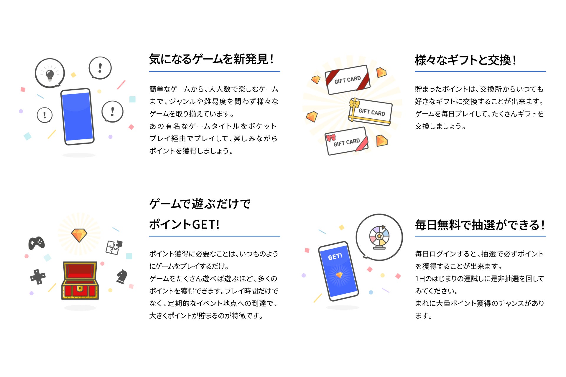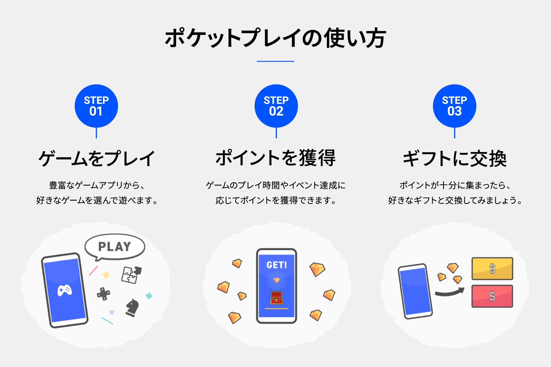 ①『ポケットプレイ』をダウンロードして、気になるゲームを選んでダウンロード ②ダウンロードしたゲームのプレイ時間、特定の成果条件(イベント)に到達することで、ポイントを獲得 ③貯めたポイントを好きなギフトに交換 |