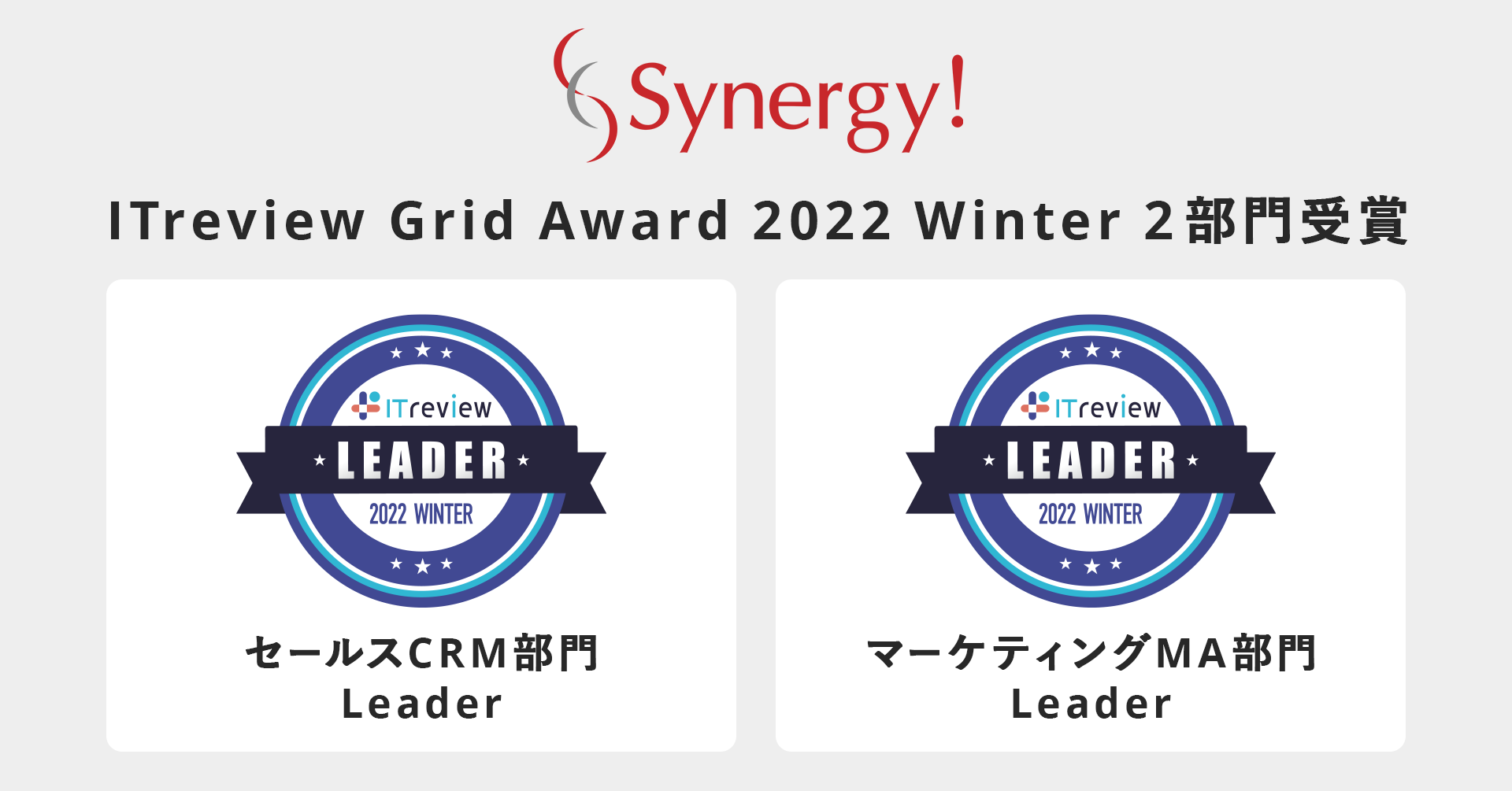シナジーマーケティング株式会社(本社:大阪市北区、代表:田代正雄、以下「当社」)は、当社が提供するクラウド型サービス「Synergy!(シナジー)」がアイティクラウド株式会社(本社:東京都港区、代表取締役社長:黒野源太)運営のIT製品レビュープラットフォーム「ITreview(アイティレビュー)」において、満足度、認知度ともに優れた製品であると評価され「ITreview Grid Award 2022 Winter」セールスCRM部門において10期連続で「Leader」を受賞したことをお知らせします。マーケティングMA部門においても6期連続で「Leader」を受賞し、2部門受賞となりました。