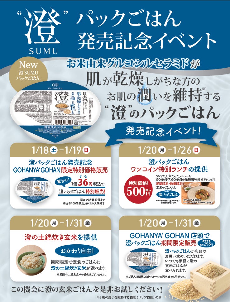 肌が乾燥しがちな方のお肌の潤いを維持する機能性表示食品のパックごはん×GOHANYA' GOHANみなとみらい店のコラボイベントを開催!2日間限定で『澄 SUMU』パックごはんの特別価格販売も実施!