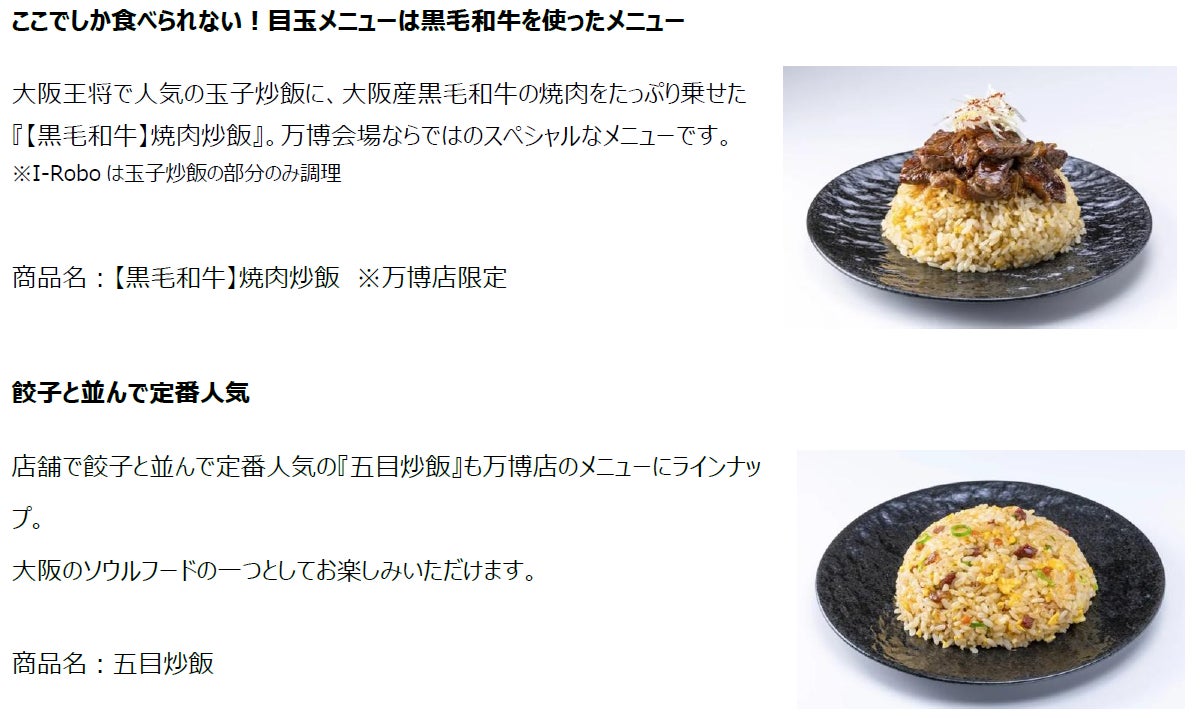 「大阪のれんめぐり~食と祭 EXPO~」は、白ハト食品工業株式会社(本社:大阪府守口市、代表取締役社長:永 尾 俊一)を中心に大阪を代表する老舗・銘店 13 店舗が一堂に集結したブースです。万博内最大規模となる飲食ブース“サスティナブルフードコート”は、ロボットとヒトが協働する未来の社会を映しだす次世代の飲食店モデルを体感できるエリアとなります。I-Roboは、こちらのフードコート内大阪王将万博店にて、定番の「五目炒飯」に加え、博多店限定の【黒毛和牛】 焼き肉炒飯(※炒飯部分のみ)を調理します。「食を通じて、ワクワクする未来を。」のパーパスの下、社会課題解決に挑み、持続可能な社会の実現に貢献していく大阪王将のチャレンジをテックマジックとI-Roboがサポートいたします。