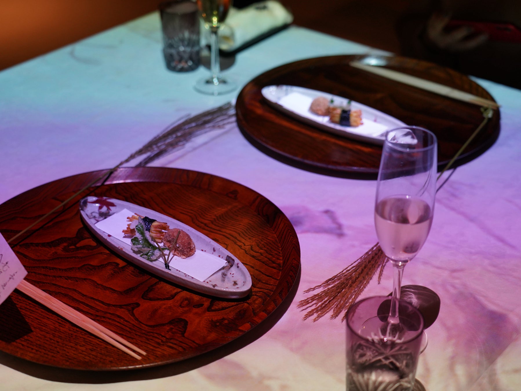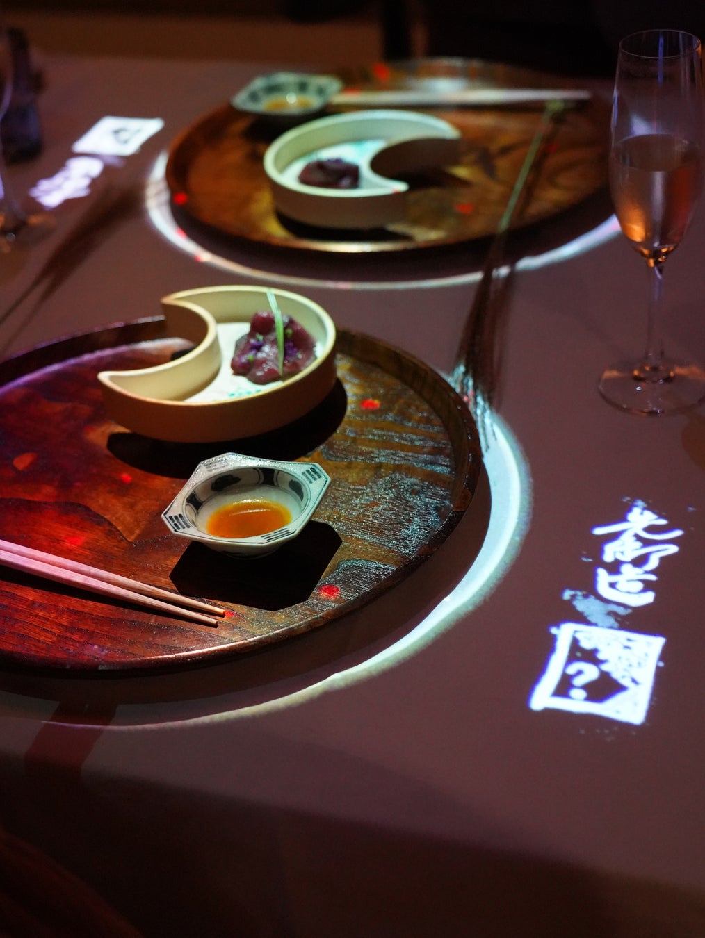 【プログラム内容】料亭河文の会席料理(全12品)を味わいながら、料理の皿や卓に合わせたデジタルアートの演出や、愛知県美術館で開催された「曽我蕭白 奇想ここに極まれり」とのコラボレーションにより、曽我蕭白の作品をモチーフにしたデジタルアートの演出、河文が所有する曽我蕭白筆の掛軸の特別公開も行いました。