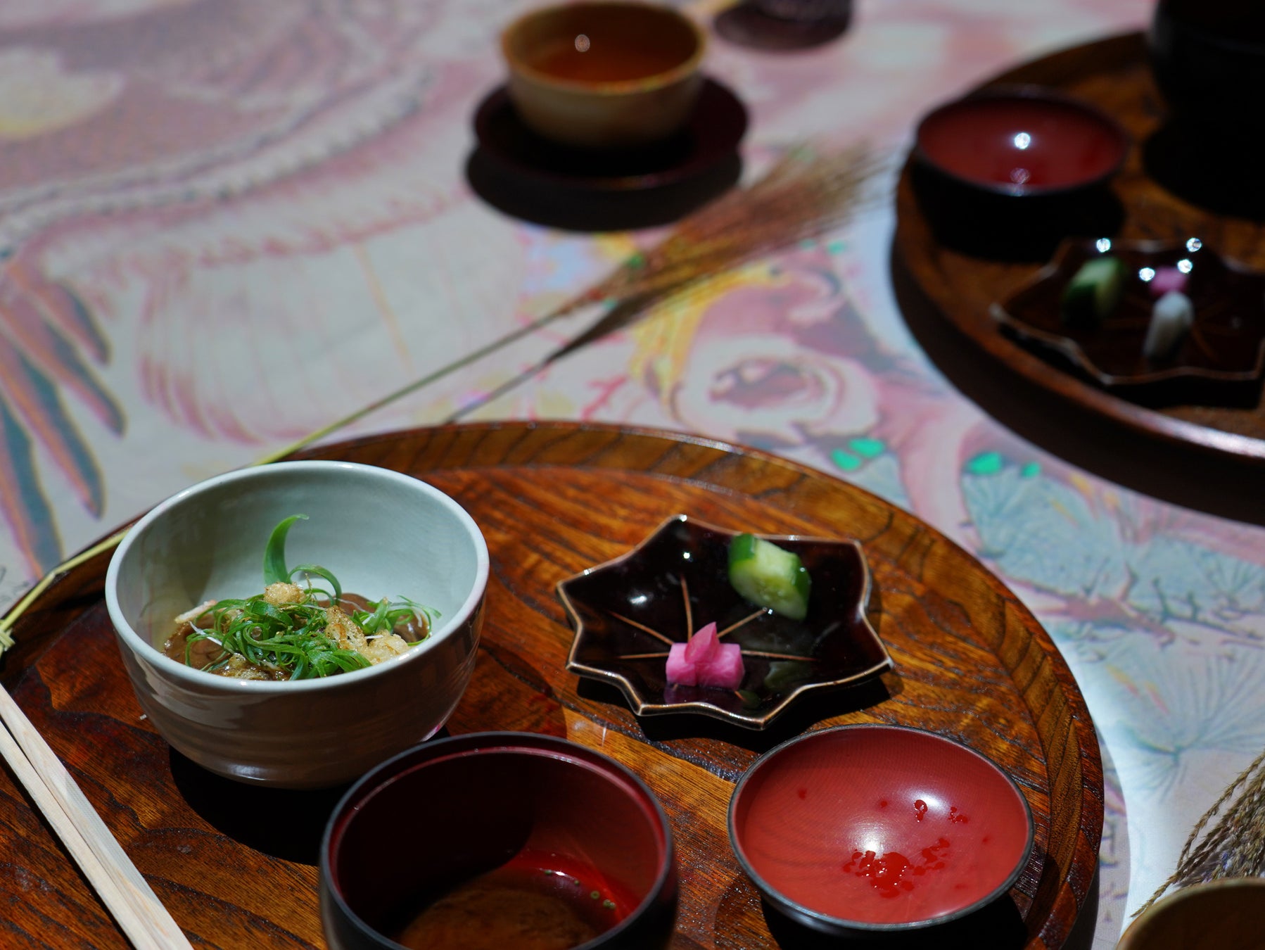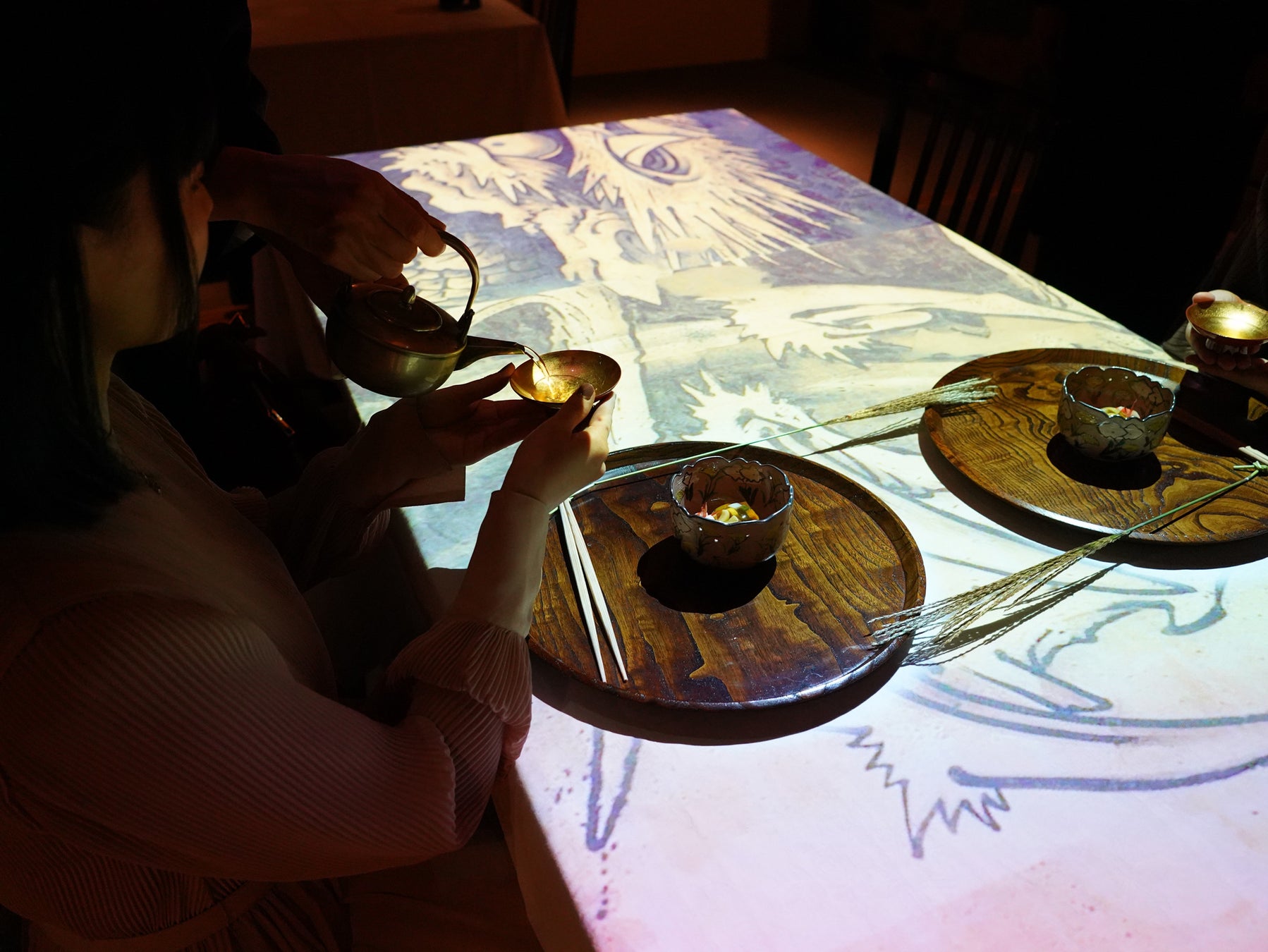 本プログラムでは、料亭河文の会席料理(全12品)を味わいながら、料理の皿や卓に合わせたデジタルアートの演出や、愛知県美術館で開催された「曽我蕭白 奇想ここに極まれり」とのコラボレーションにより、曽我蕭白の作品をモチーフにしたデジタルアートの演出、河文が所有する曽我蕭白筆の掛軸の特別公開も行いました。