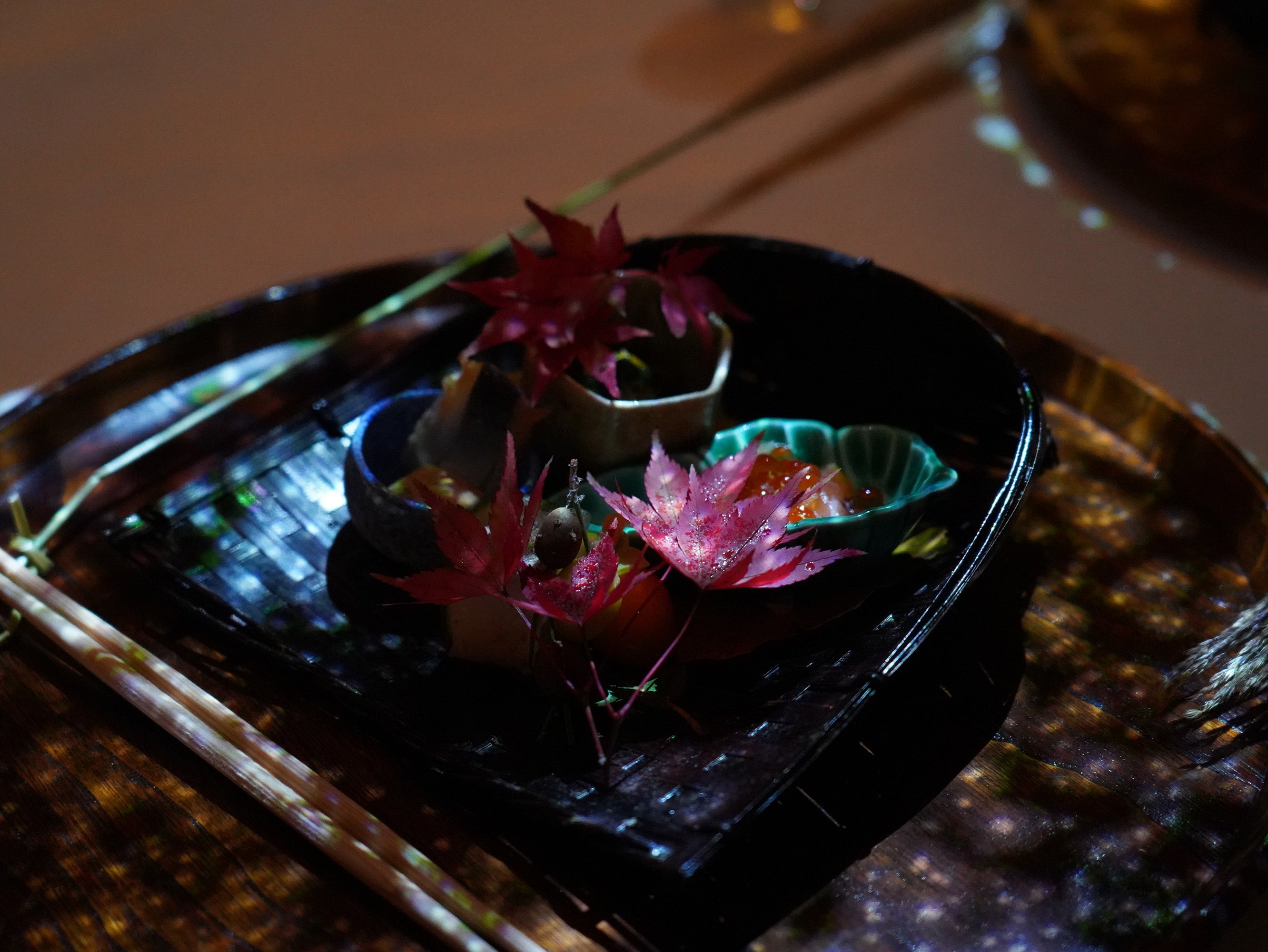 先付 縁起野菜/八寸 中秋の名月/御椀 土瓶蒸/先御造 紅葉肉/後御造 時之物三種/焼物 真魚鰹/箸休 蕪蒸/揚物 太刀魚/進肴 近江牛/口直 白和/御飯 松茸御飯、鯛茶漬、咖喱御飯/甘味 栗/薄茶
