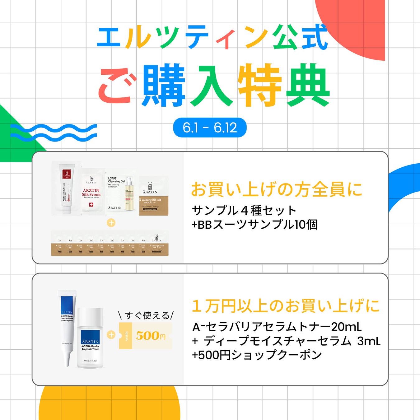 お買い上げの方全員にエルツティン人気の豪華スキンケアサンプルセットや、1万円以上のお買い上げには「A-セラバリアラインミニチュア」サンプル2個が特典としてつくので注目!