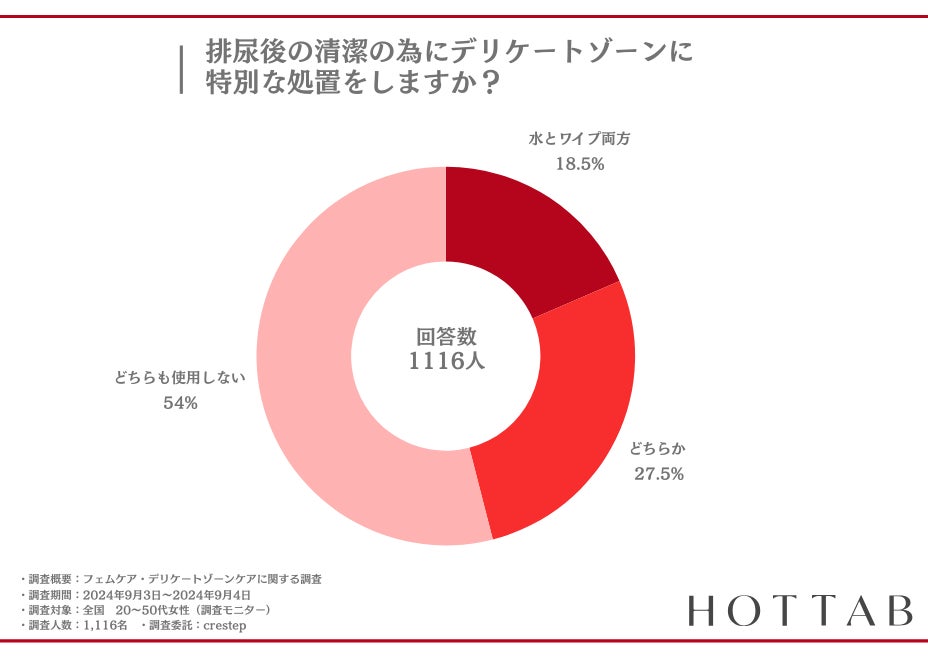 排尿後にデリケートゾーンの処置をしている方は半数以下で、特に水やワイプなど使用していない方が半数以上いるようです。