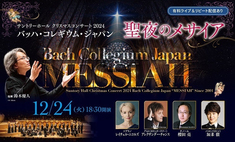 サントリーホールは、2024年12月24日(火)、25日(水)に、2企画のクリスマスコンサートを開催します。24日は世界トップレベルの人気と実力を誇るバッハ・コレギウム・ジャパン(BCJ)が出演する『メサイア』全曲演奏会、25日は指揮:大友直人とナビゲーター:森川智之、新日本フィルハーモニー交響楽団による、バレエ組曲『くるみ割り人形』や交響組曲『シェエラザード』など「物語」を感じられる名曲をお贈りするオーケストラ公演です。クラシックファンにもコンサートが初めての方にも幅広く「コンサートのあるクリスマス」をご提案する2つのクリスマス企画です。両公演とも、好評につき公演チケットは予定枚数終了、人気公演をオンライン配信ならではの臨場感のある映像と音楽をお好きな場所と時間でお楽しみいただけます。