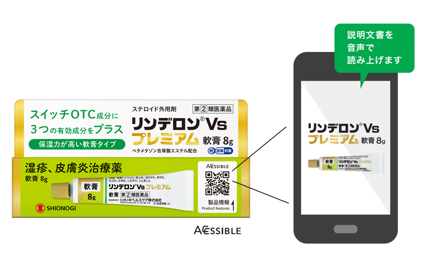 パッケージ表面には、PIJIN社が提供する7言語(日本語・英語・簡体字・繁体字・韓国語・ポルトガル語・ベトナム語)に対応のQRTコード「QR Translator」の「アクセシブルコード」※1を採用。スマートフォンなどでコードを読み取ると、自動音声による読み上げ機能で効果・効能、用法・用量などの説明を聞くことができます。