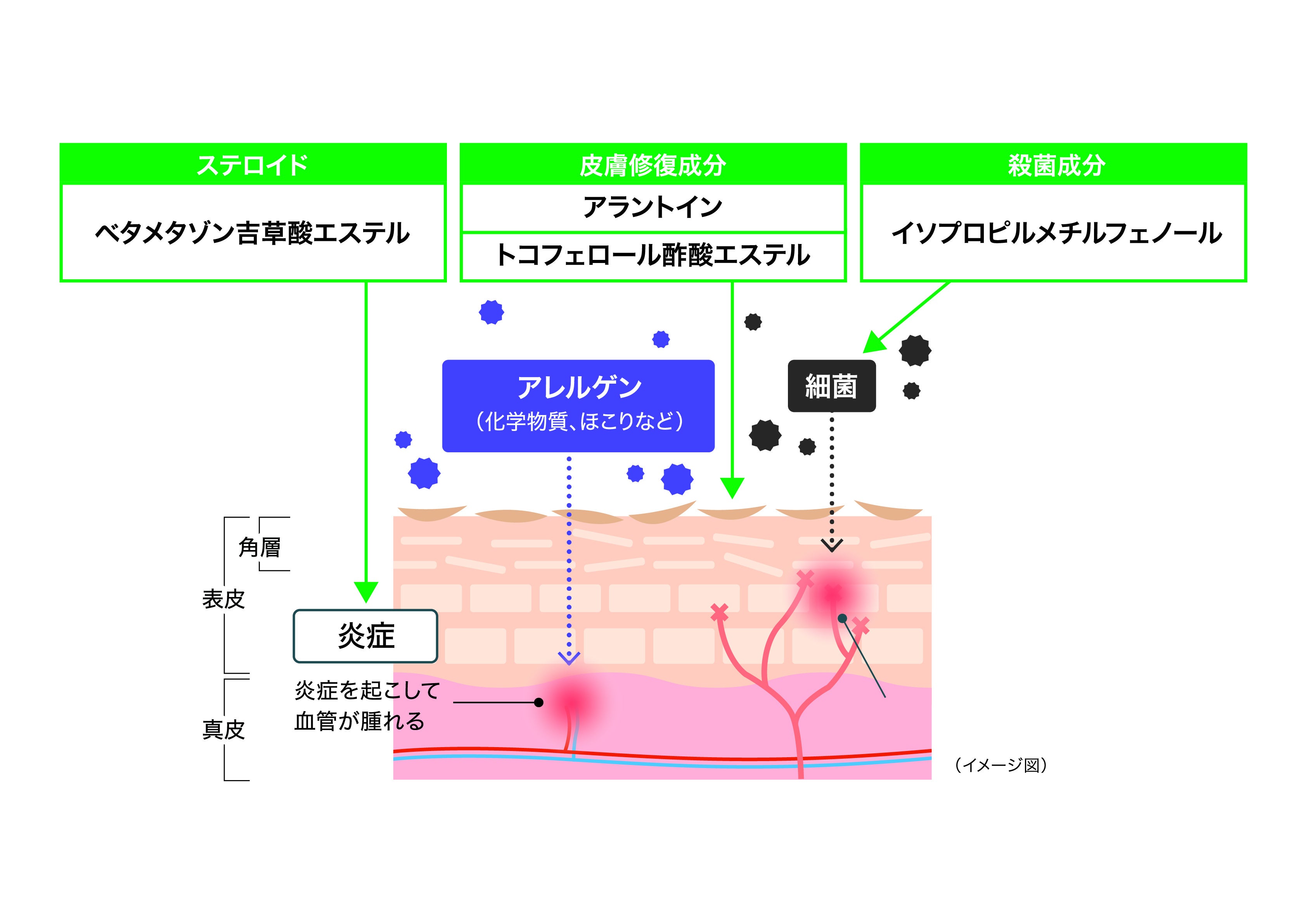しっしん、皮ふ炎などの炎症をおさえ、かゆみをしずめる「ベタメタゾン吉草酸エステル」に、皮膚修復成分(アラントイン、トコフェロール酢酸エステル)、殺菌成分(イソプロピルメチルフェノール)の3つの有効成分を配合。損傷皮膚の治療を促進します。皮膚の保湿・保護作用が高い軟膏と、伸びがよくベタつきが少ないクリームの2種類を販売します。