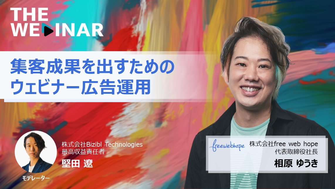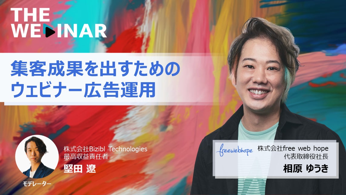 第4弾企画は、株式会社free web hope 代表取締役社長の相原ゆうき氏をゲストに迎え、「集客成果を出すためのウェビナー広告運用」というテーマでお届けします。