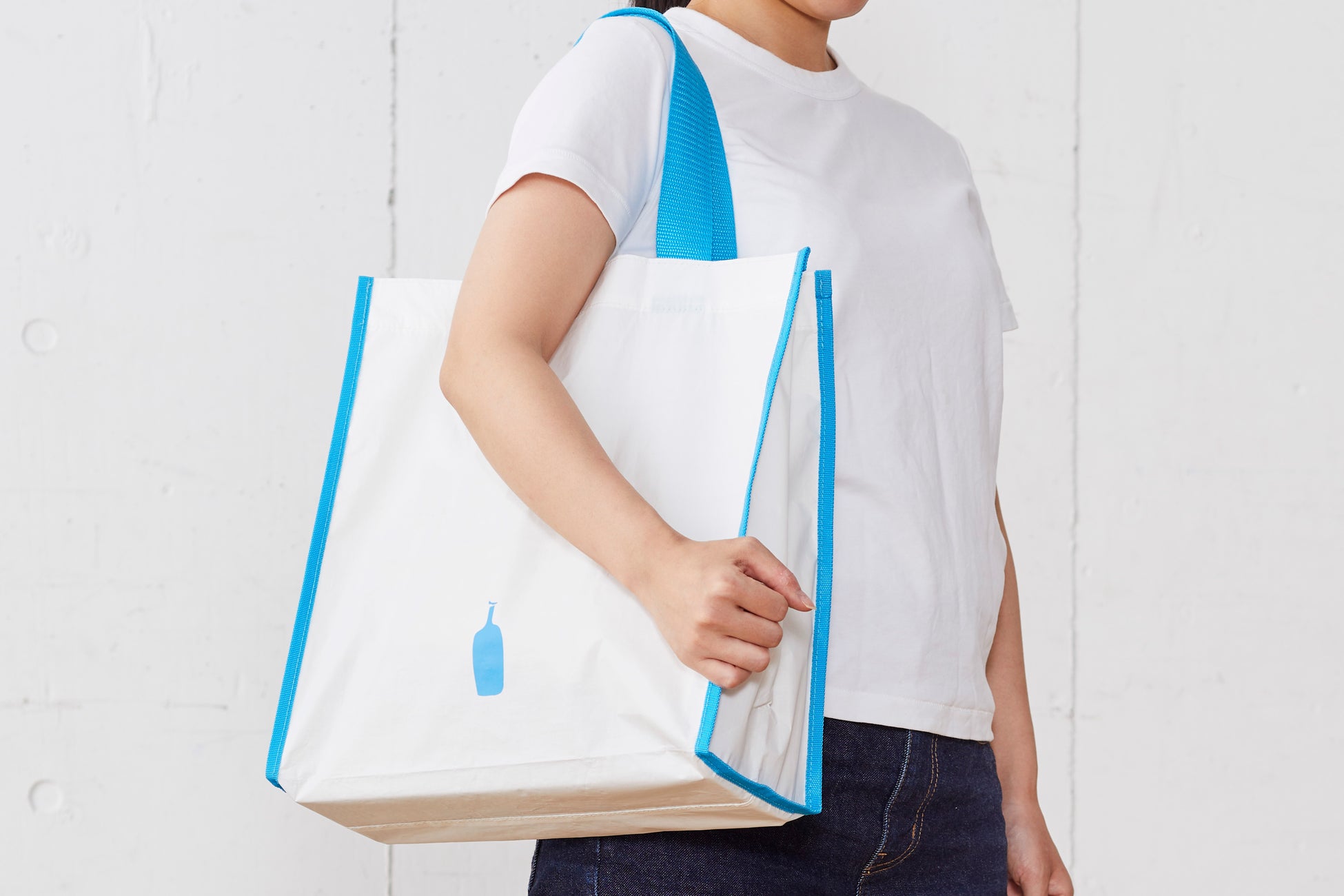 夏のお出かけにぴったりな爽やかで明るい配色のCARRY BAGを新たなアイテムとしてご用意いたしました。マットな質感の明るいホワイトカラーに、ブルーボトル ロゴとサイドのブルーのパイピングがポイントのバッグです。軽くて濡れても問題ない素材なので、ビーチやプールサイドでお使いいただけるのはもちろん、日々のお買い物などでたくさんの荷物を運ぶ際にもおすすめです。ぜひこの夏、さまざまなシーンでご活用いただけると嬉しいです。