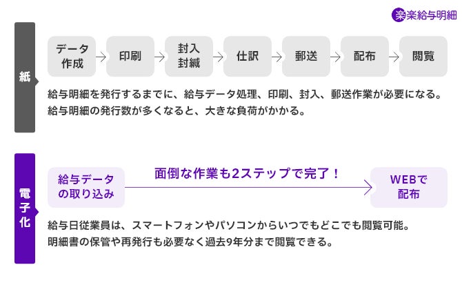 「楽楽給与明細」は前述した課題を解決し、給与明細のデジタル化を実現します。