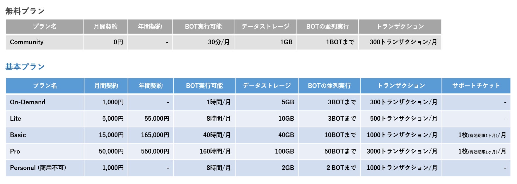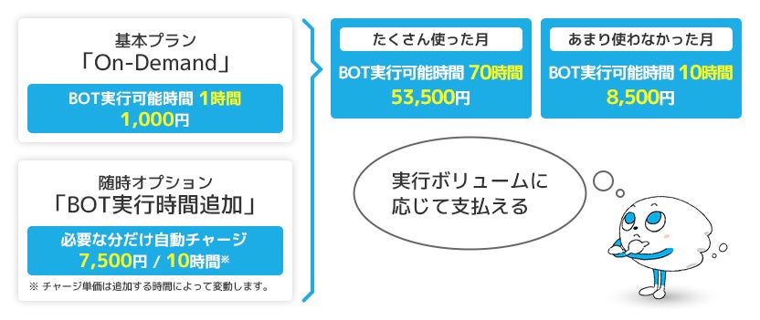 時期によって実行ボリュームが変動する場合や、必要な実行時間の予測が困難な場合は、有料プランの機能を利用できる最小の基本プラン「On-Demand」、随時オプション「BOT実行時間追加」の組み合わせがおすすめです。基本プランはお安く、月間のBOT実行ボリュームに応じてご請求が発生します。