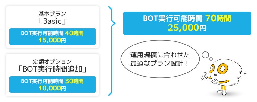例えば、月間70時間の実行時間が必要な場合、基本プラン「Basic」(40時間/月)と、定額オプション「BOT実行時間追加」(30時間/月)を組み合わせる事で、70時間のBOT実行時間を確保できます。