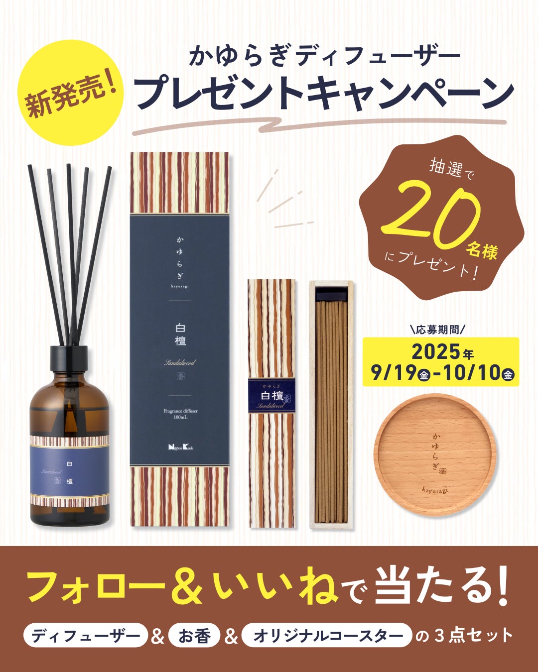 日本香堂公式Instagramでは、9月19日(金)より「かゆらぎディフューザー プレゼントキャンペーン」を実施いたします。