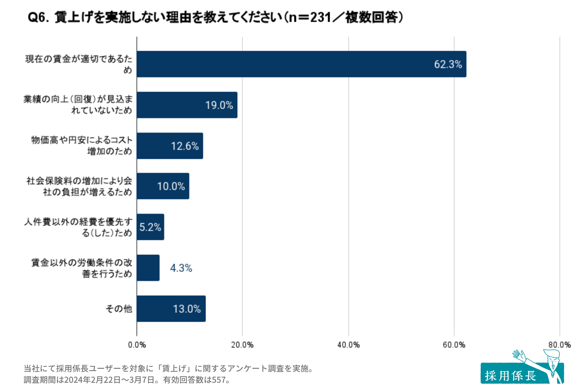 1位は「現在の賃金が適切であるため」で、62.3%が回答。前回調査(n=152)から24.8ポイント上昇しています。前回1位の「業績の向上(回復)が見込まれていないため」は、28.4%減少して2位に順位を下げました。