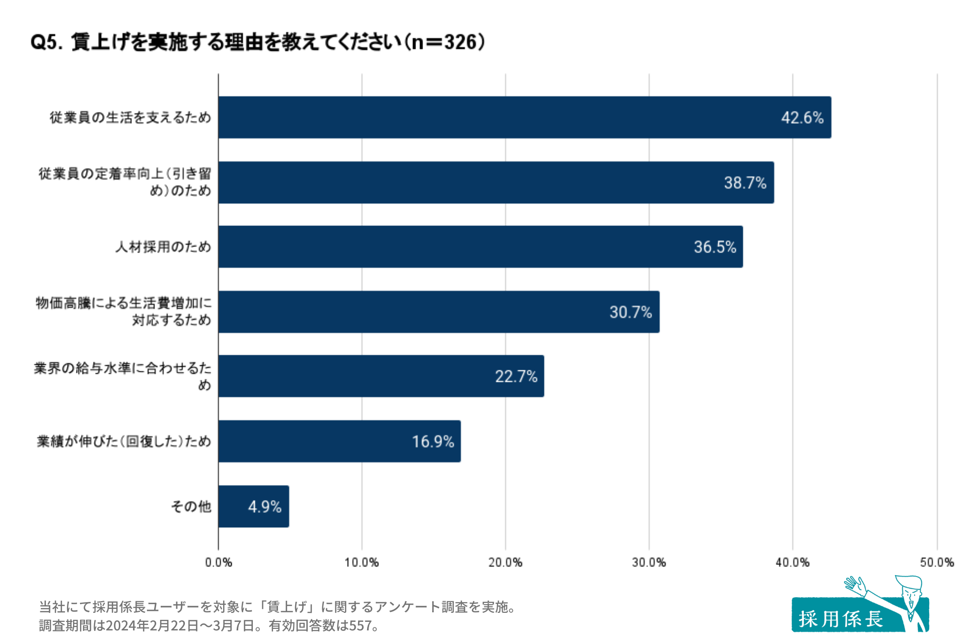 賃上げ理由上位は「従業員の生活を支えるため」「定着率向上のため」「人材採用のため」