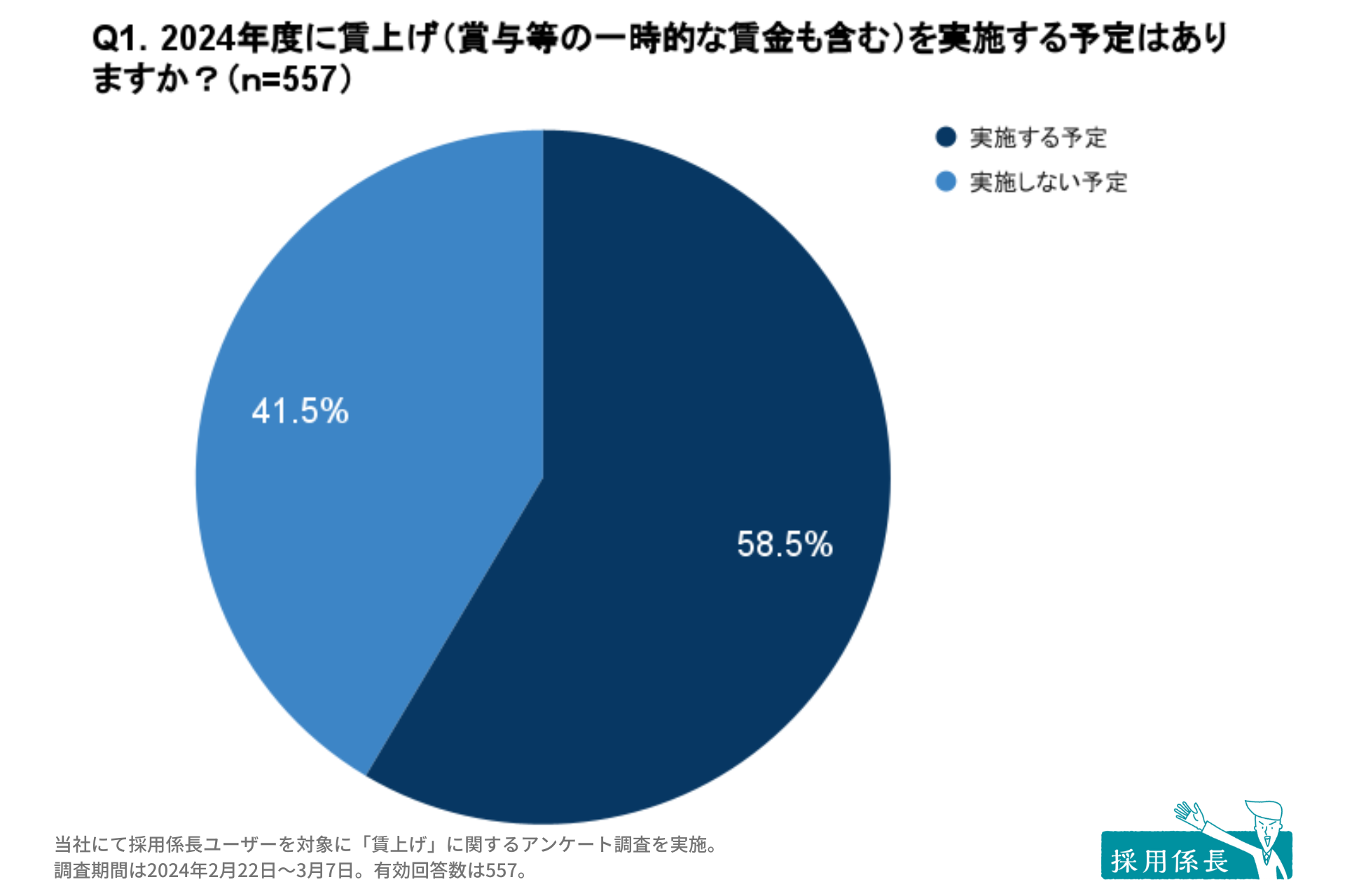 今回の調査では、中小企業における2024年度の賃上げ予定に関するアンケートを実施しました。結果は、賃上げを「実施する予定」と回答した事業所が58.5%。1年前(2023年3月)に実施した前回調査から3.9ポイント上昇しています。