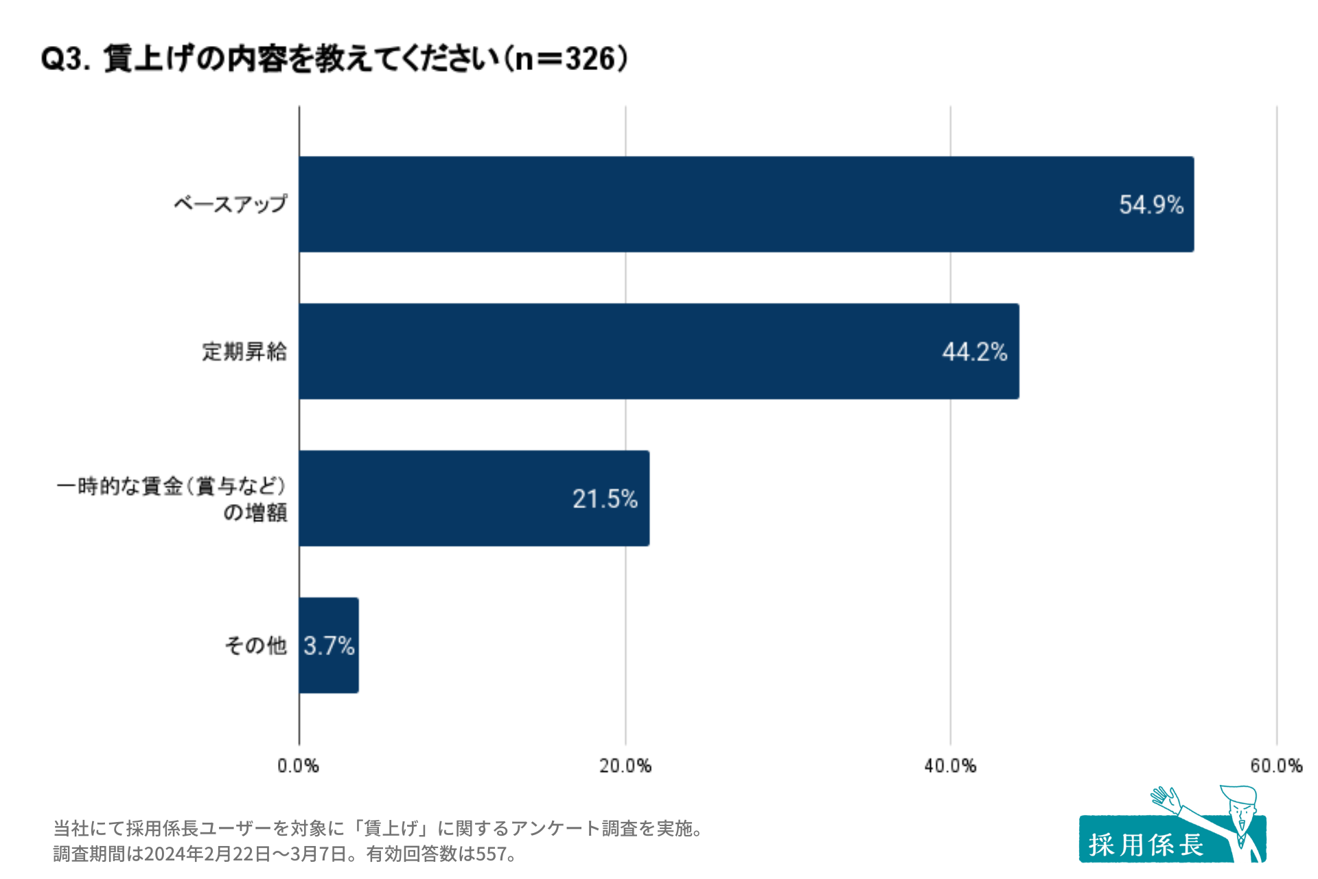 賃上げ予定の内容については、半数以上の事業所が「ベースアップ」と回答しています(n=326)。前回調査と比べて3.5ポイントの上昇です。一方、「定期昇給」は8.3ポイント減少する結果となりました。