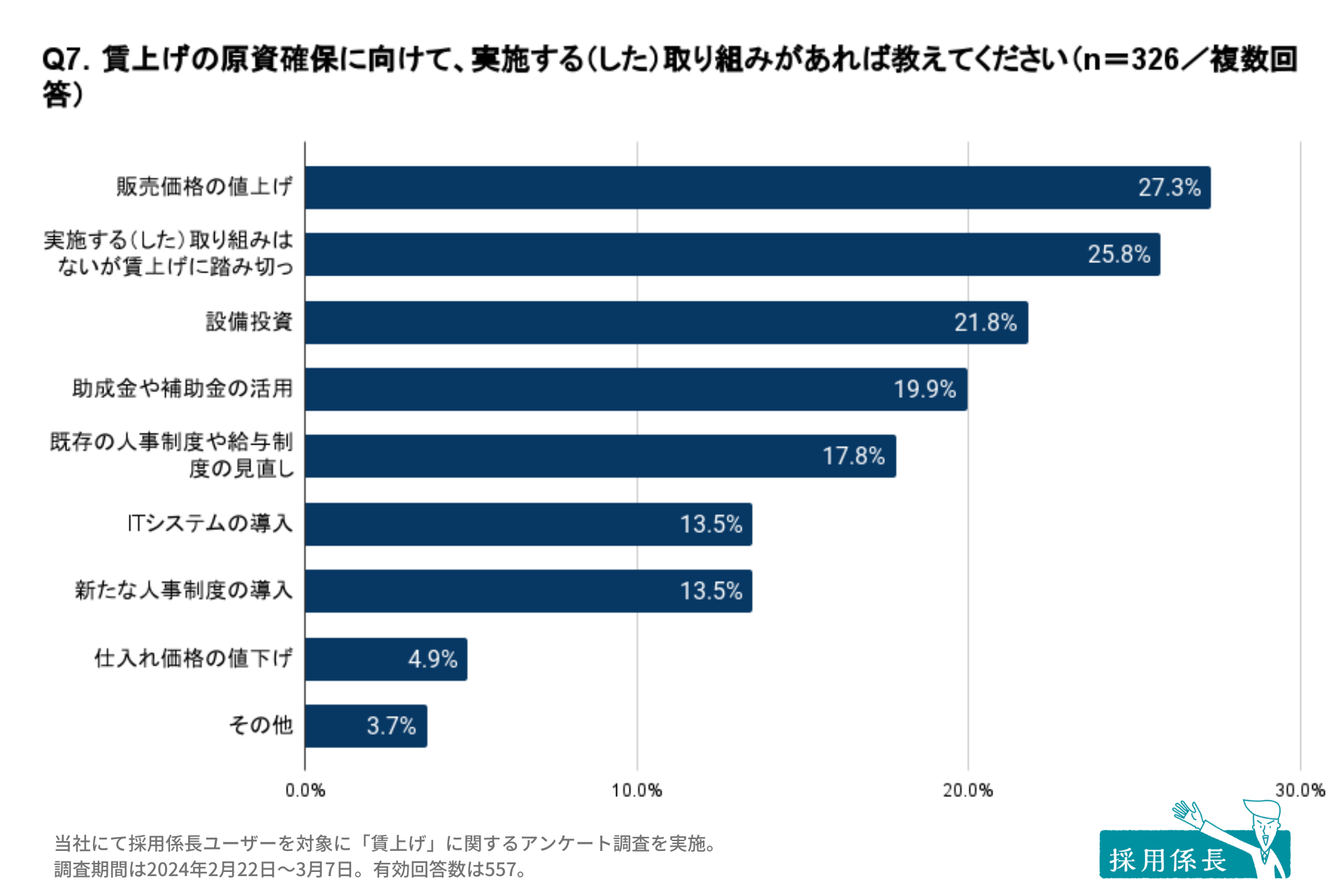 Q1の質問で賃上げを「実施する予定」と回答した事業所(n=326)へ、賃上げの原資確保に向けて実施する(した)取り組みについて質問したところ、1位は「販売価格の値上げ」でした。