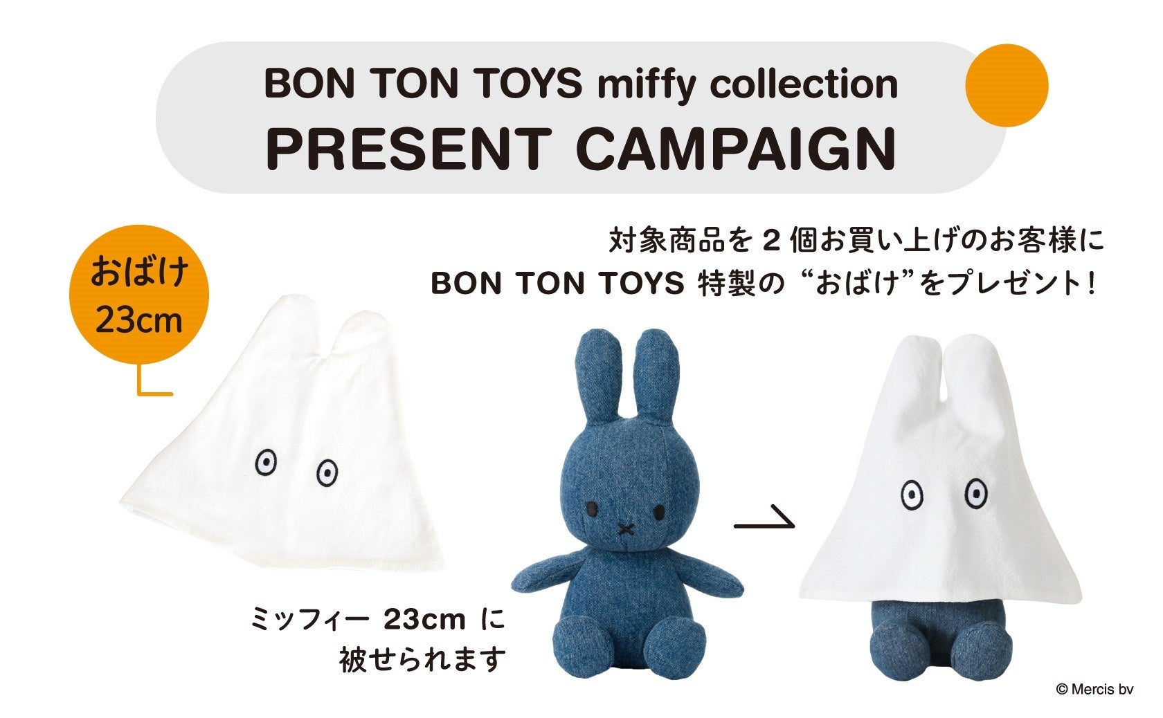 ミッフィー23cmサイズの商品(Corduroyシリーズ、Denimシリーズ、Organic Cottonシリーズ、Recycle Teddyシリーズ、Checkシリーズ、Terryシリーズ)を対象とし、2個ご購入いただいた皆様にミッフィー23cmサイズに被せて「おばけミッフィー」に変身させることができる『おばけ 23cm』をプレゼントいたします。気分や季節に合わせて「おばけミッフィー」と「ミッフィー」を両方楽しめます。お手持ちの23cmサイズの「ミッフィー」にかぶせて、お楽しみいただくことも可能です。