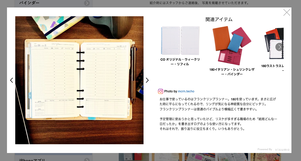 #フランクリンプランナーがついた投稿はインスタグラム上で実に45,000件以上。その中から投稿をvisumoでピックアップし、掲載、利用商品を紐付けています。投稿を通して、検討ユーザーに対して商品ページの説明だけでは伝わりづらい手帳を利用するベネフィットを伝えることが狙いとなっています。