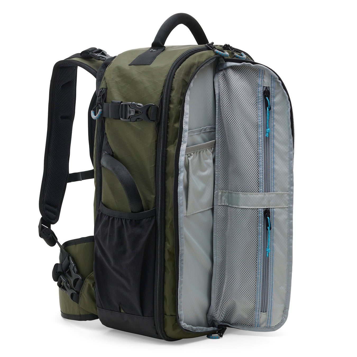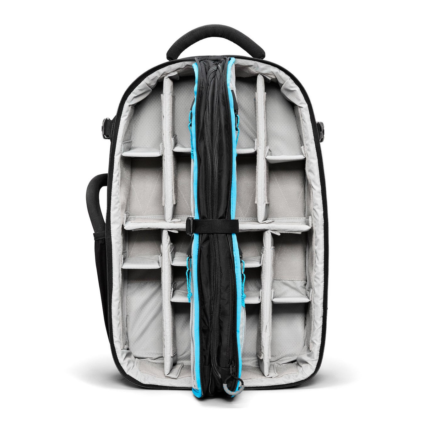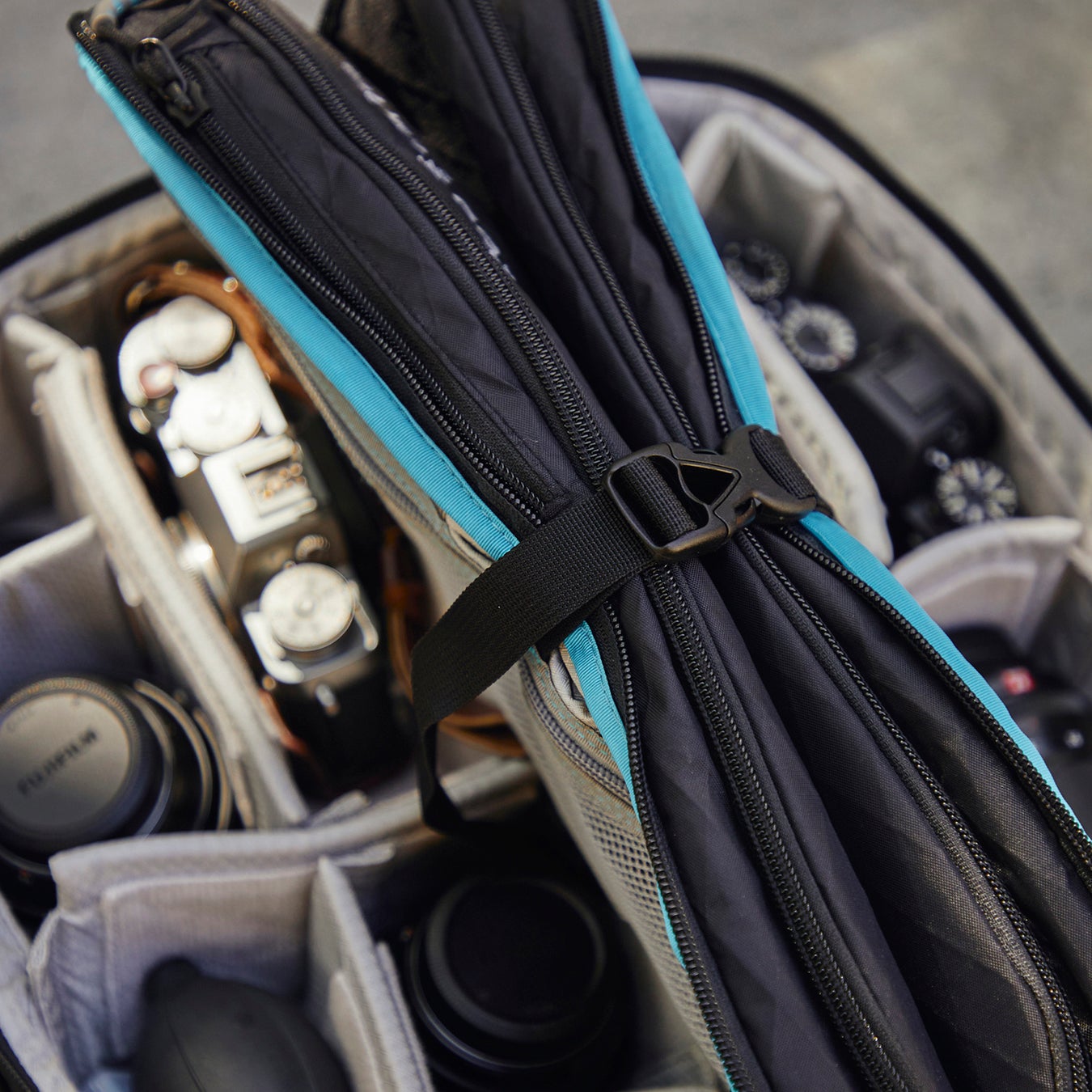 このスタイルによりメインコンパートメントが縦半分ずつの2気室に分かれ、片方に望遠レンズ、もう片方に標準ズームレンズやカメラボディを収納するなど、異なる機材を効率的に整理・収納できます。両側のフロントパネルを開いた際に閉じないようにバックルで固定でき、狭いスペースでも機材の出し入れがしやすく、機材の整理や収納をスムーズに行えます。フロントパネルの裏側にはメインコンパートメント外側にはジッパー付きのメッシュポケットが二つずつ備えられ、細かいアイテムの収納に役立ちます。また、さまざまな機材収納のパターンに対応できるように充分な数のディバイダーが付属します。ディバイダーはオートバイのヘルメットにも採用される Artilon foam(アーティリオン フォーム)を使用し、薄型で軽量ながら耐衝撃性に優れています。