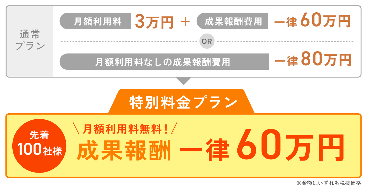 「glorious_」は、月額プラン(月額利用料3万円+成果報酬60万円)、成果報酬プラン(月額利用料なし+成果報酬80万円)としています。今回、ベータ版リリースを記念して、先着100社様への特別料金プラン(月額利用料なし+成果報酬60万円)をご提供いたします。※金額はいずれも税抜価格