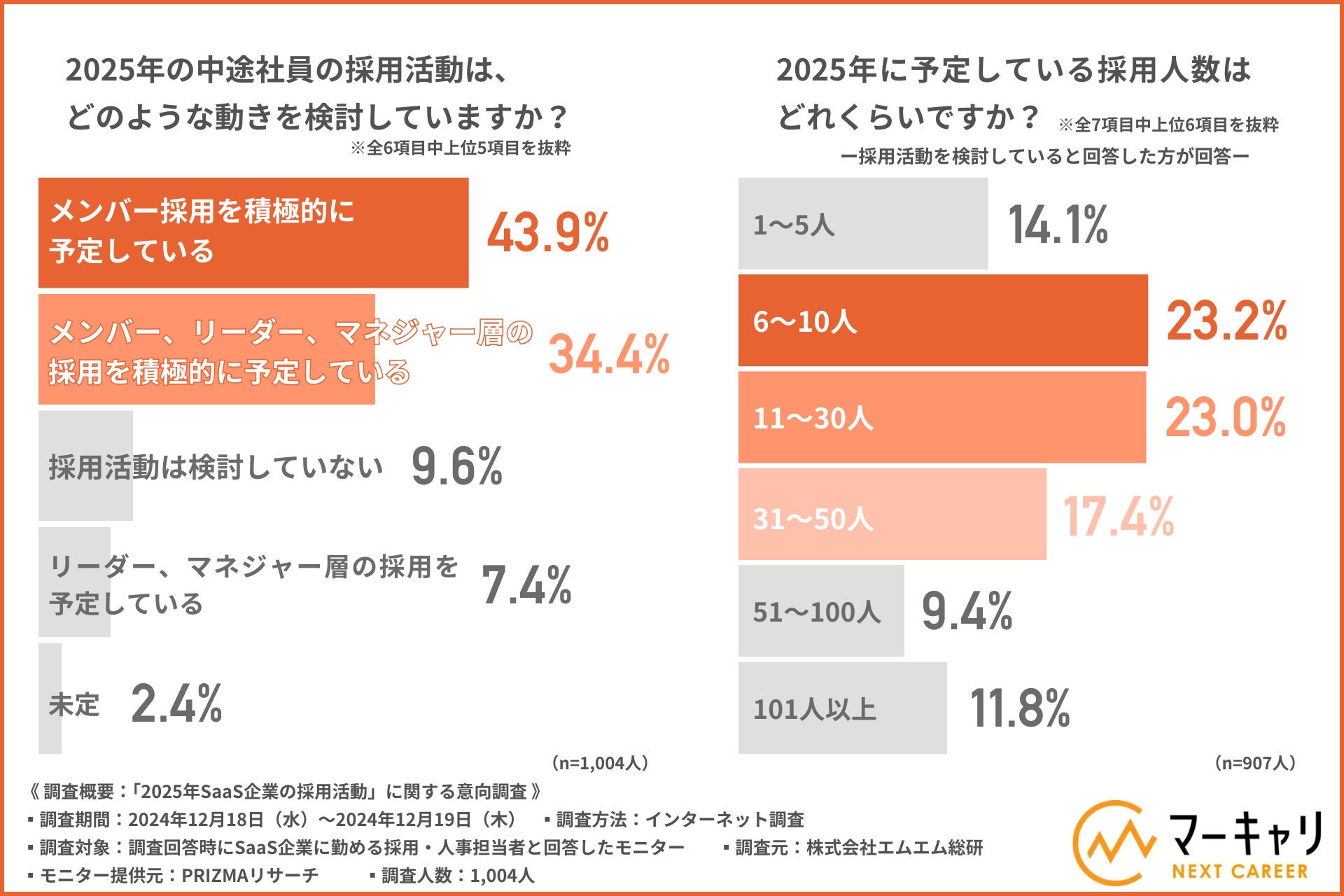 採用予定人数については6~10人、11~30人と回答した方が最も多く、2025年も引き続きSaaS業界では中途採用市場が活発化することが予想されます。