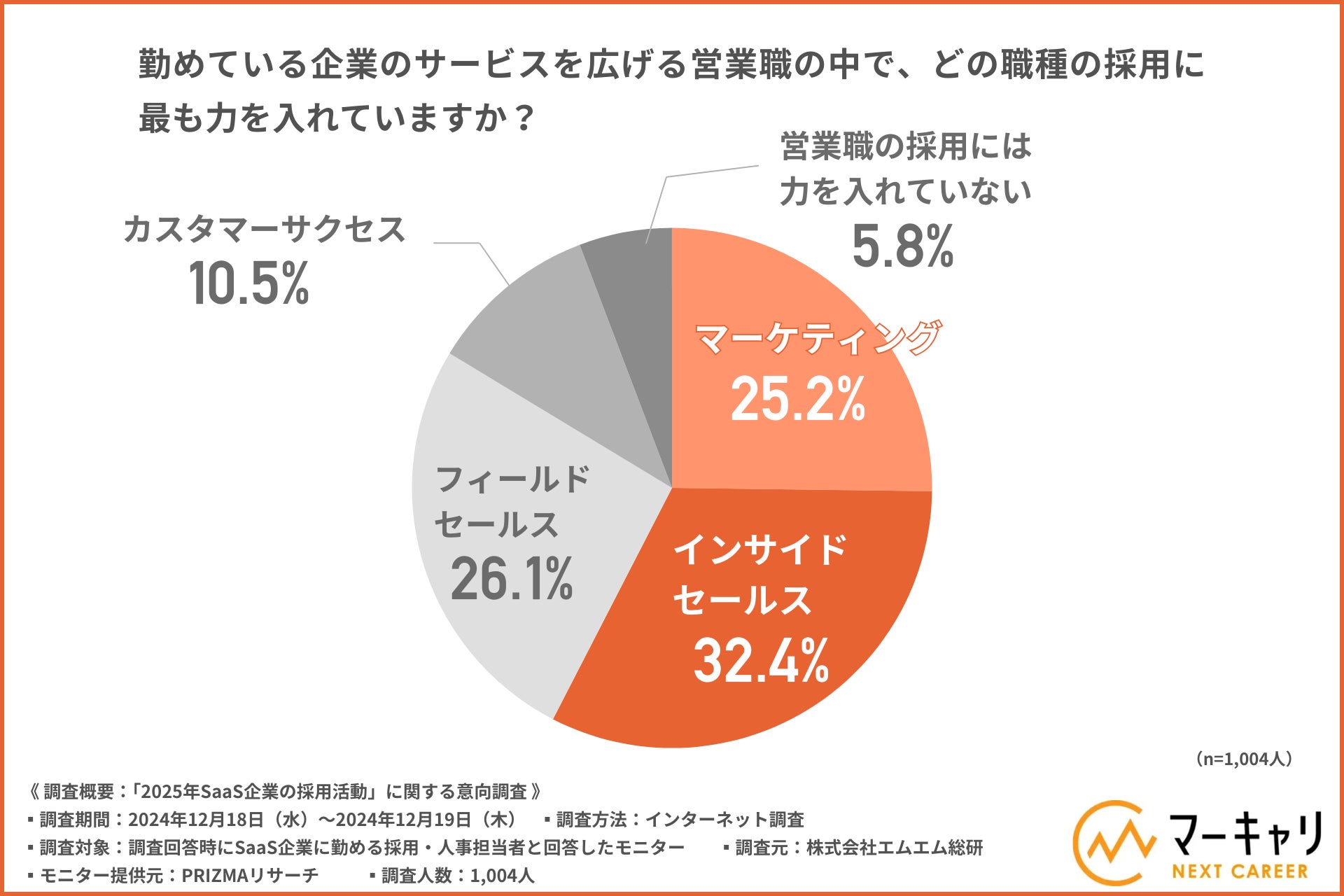 「勤めている企業のサービスを広げる営業職の中で、どの職種の採用に最も力を入れていますか?」と質問したところ、『インサイドセールス(32.4%)』が最多で、『フィールドセールス(26.1%)』『マーケティング(25.2%)』と続きました。