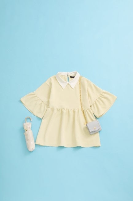 クレリックカラーでガーリーな印象を与えるブラウスと、トレンドのリトルショルダーバッグ、そして上品なデザインのアンブレラを合わせたコーディネート。上品で柔らかな印象に。