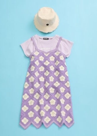 かぎ針編風のクロッシェライクのワンピースを主役に、ワッフル素材がキュートなプルオーバーと、フリンジ付きのバケットハットを合わせて。