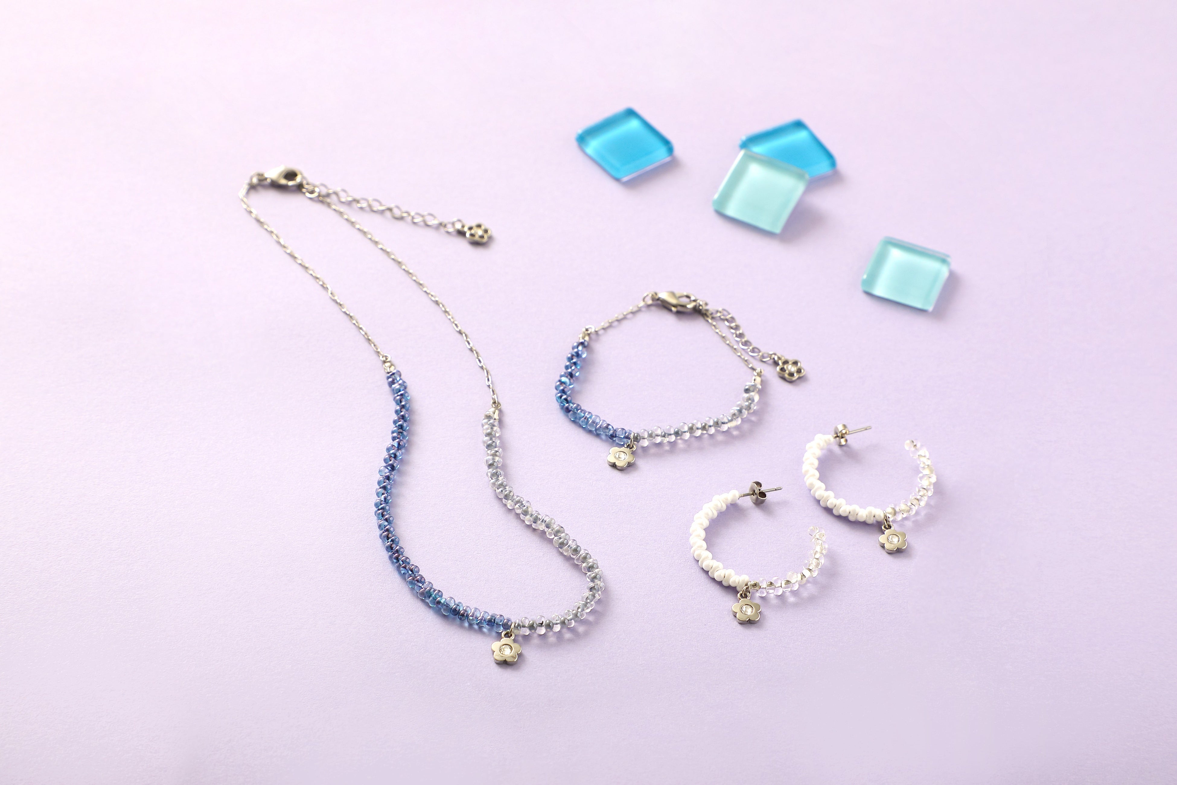 涼しげな雰囲気を演出するピアス、ネックレス、ブレスレット。