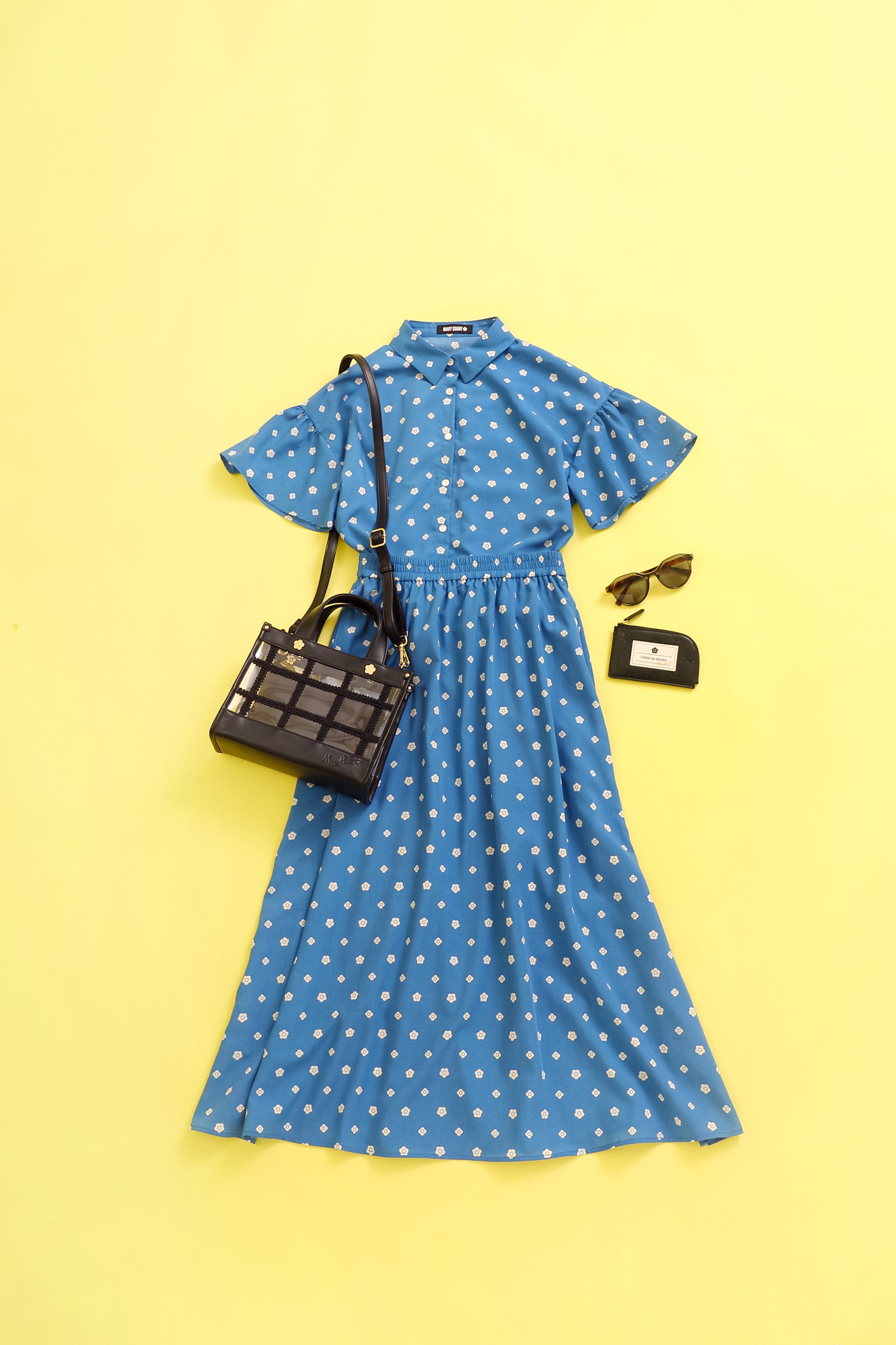 オパール加工のシアーワンピースと、夏らしいラタン素材のミニトートを合わせて。ワンピースのデイジーが夏の王道コーデにキュートさをプラスします。