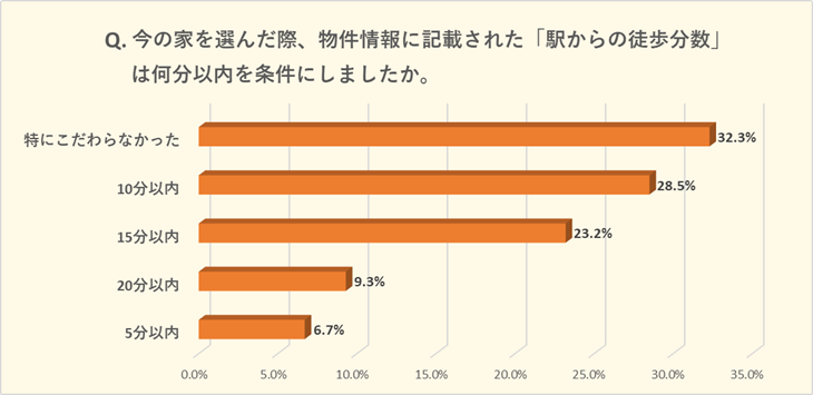 「特にこだわらなかった」32.3%が最も多く、最寄り駅への依存度は大きくないことが分かりました。利便性が高い「5分以内」を条件とする人は僅か6.7%に留まり、多くの方が10~15分以内をひとつの目安としています。