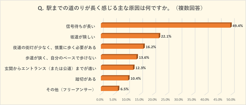 「表記通り」が約半数で最多となった一方、合計41.1%が表記よりも長いと感じており、不動産広告上の「徒歩分数」と、実際の歩行環境に基づいた生活実感には少なからず乖離があることが判明しました。その実感の乖離はどこから来るのか。Q2で「非常に長く感じる」「やや長く感じる」と回答した方に主な原因についてお伺いしました。