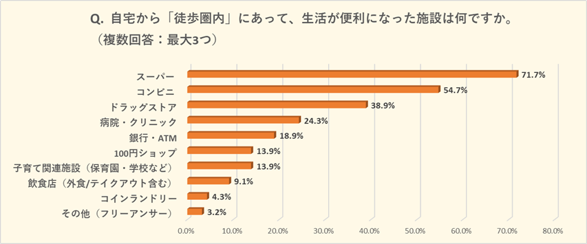3)暮らしを豊かにする近隣施設トップ3は、食と消耗品を調達する施設である「スーパー」「コンビニ」「ドラッグストア」。
