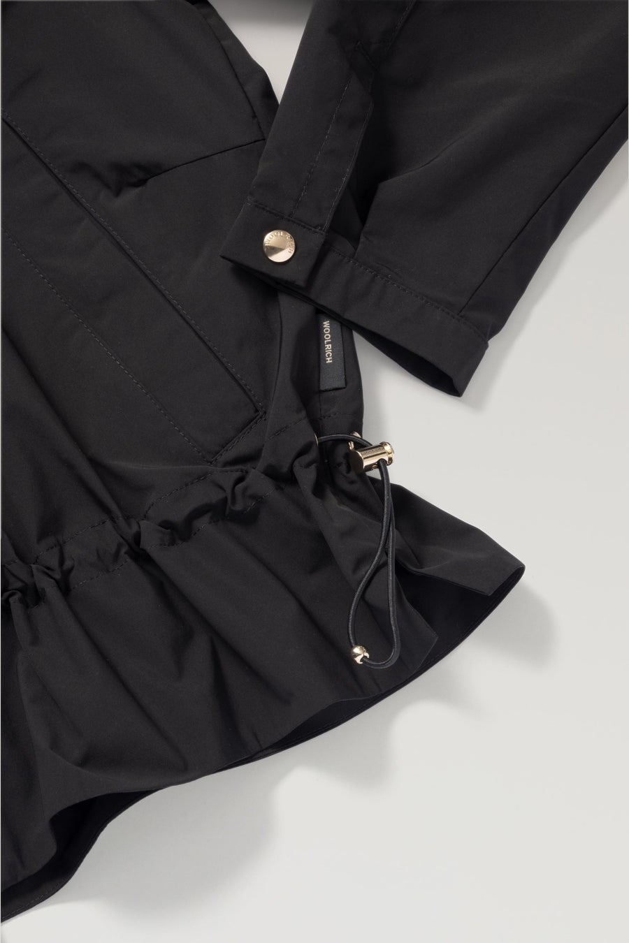 フレアシルエットが印象的なノーカラーショートブルゾン。上品な光沢ナイロンとゴールド金具がポイントで、ドローコードでシルエット調整可能。幅広いシーンで活躍する1着。
