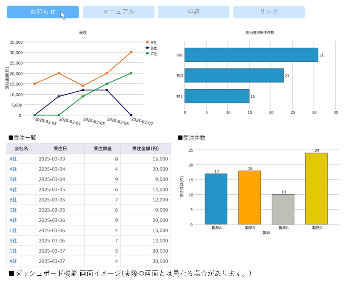 今回のバージョンの特長は、ダッシュボード機能の搭載です。この機能により、たとえば受注高や売上高、コストなどさまざまなデータを、複数の表やグラフでひとつの画面にまとめて表示し、視覚的に確認しやすくなります。これにより、迅速な情報共有を実現し、現状把握と意思決定を支援します。